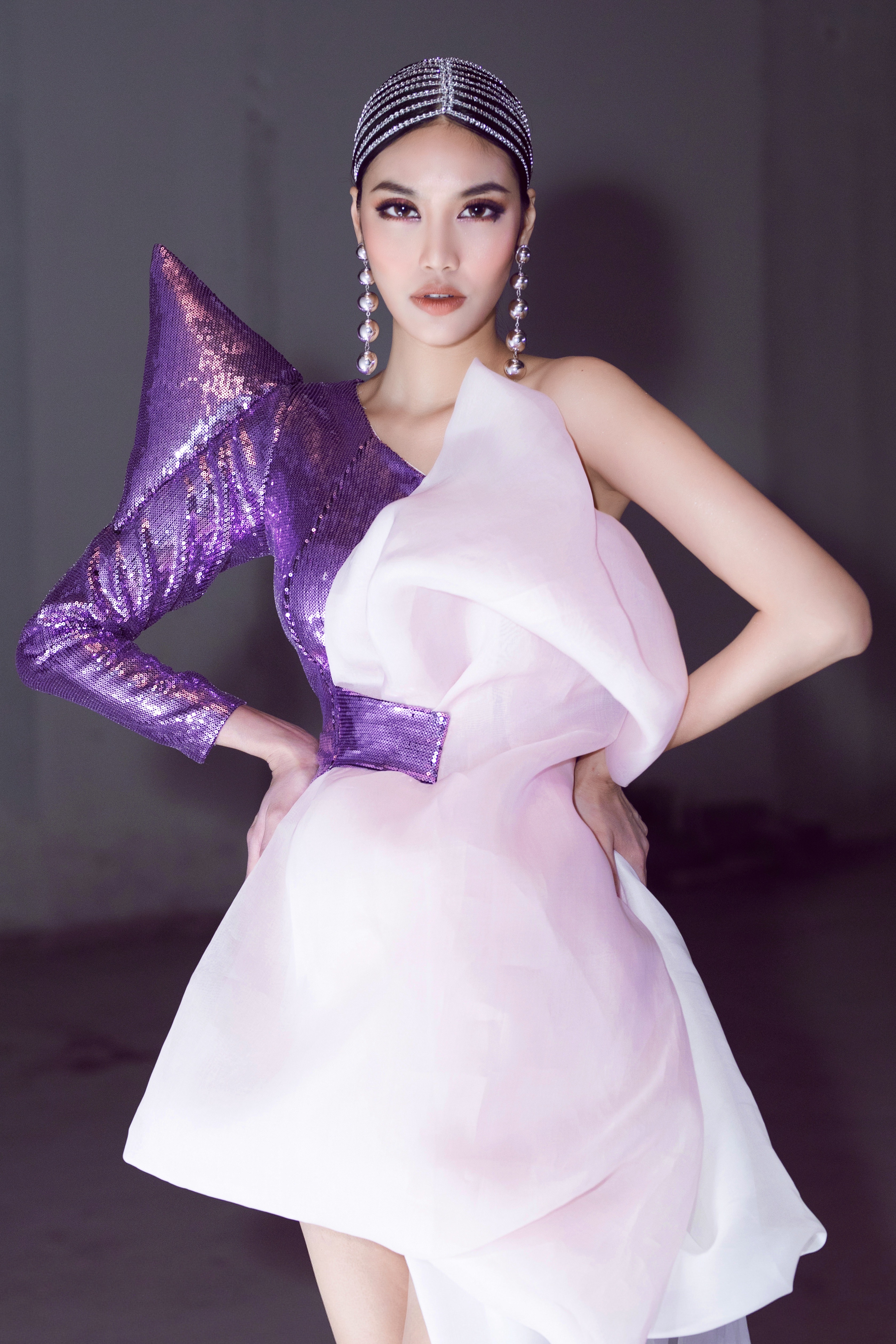 Cô diện chiếc váy bất đối xứng, có gam màu tím nổi bật cực kỳ cá tính.