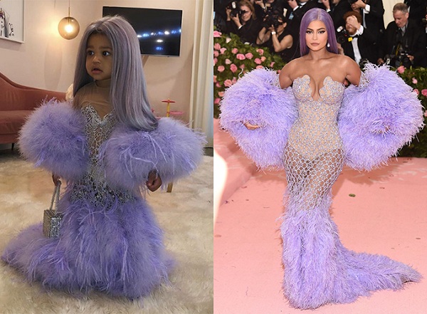 Tại Met Gala 2019 Kylie Jenner hóa thân thành “nàng tiên cá” tím với kiểu váy lưới ôm sát body cùng thiết kết lông vũ tím đi kèm, không lâu sau đó cô cũng nhanh chóng hóa trang cho con gái mình y chang bộ đồ mà mình đã từng mặc