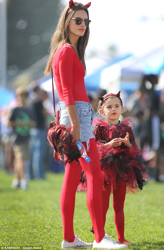 Thiên thần nội y Alessandra Ambrosio trông bốc lửa trên sàn catwalk bao nhiêu thì ngoài đời cũng như bao bà mẹ bỉm sữa khác, cô cũng chịu khó diện đồ nhắng nhít cùng cô con gái yêu trong lễ Halloween