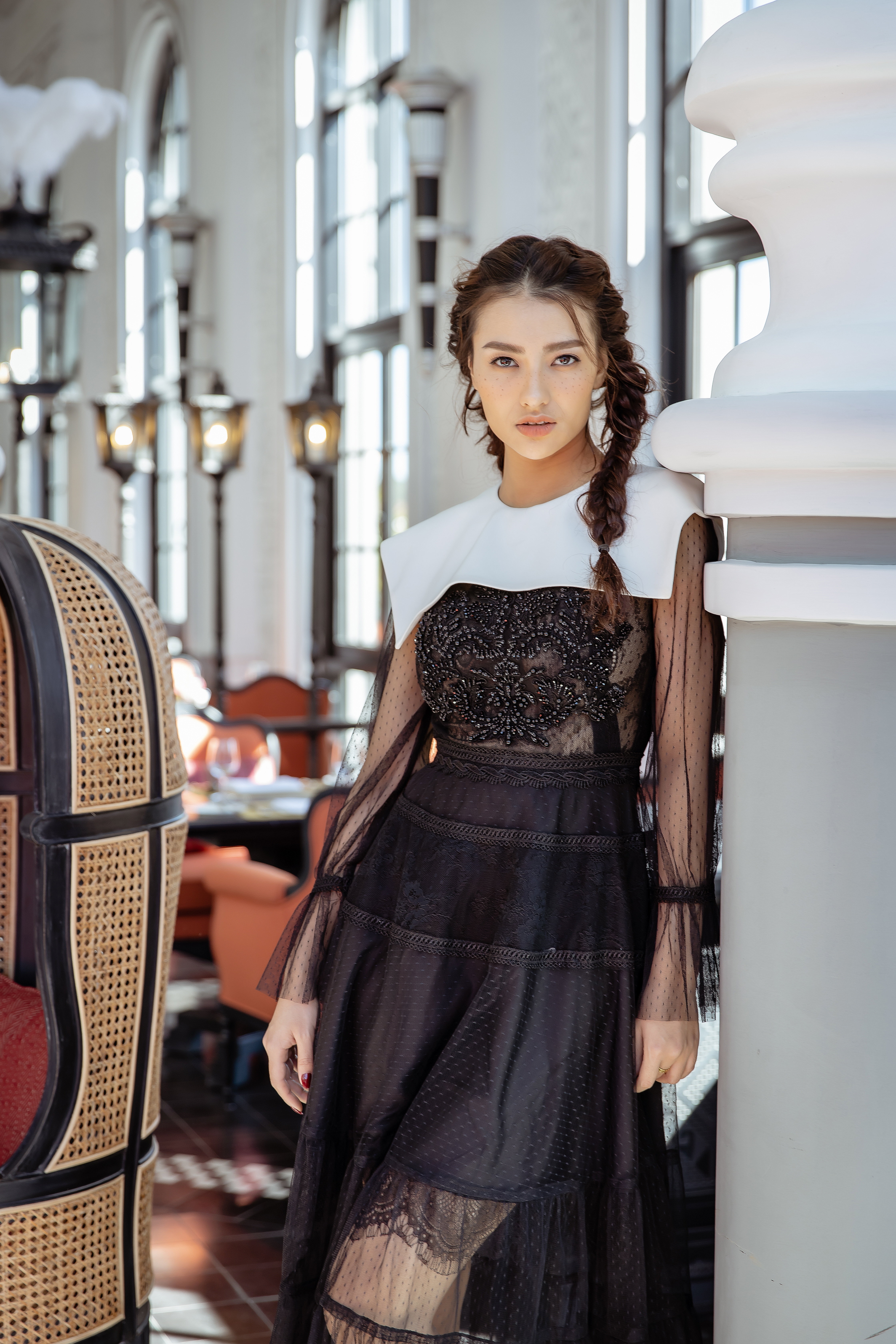 Trong bộ ảnh, Hồng Quế khoe vẻ trẻ trung, gợi cảm. Với gương mặt được trang điểm nhẹ, tóc thắt bím hai bên ngây thơ, chẳng ai nghĩ cô đã là “gái một con”. Những bộ trang phục của NTK Hà Duy với chi tiết voan xuyên thấu cũng giúp Hồng Quế để lộ đường cong cùng đôi chân dài trước ống kính.