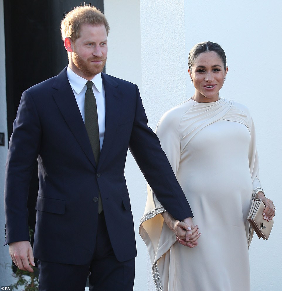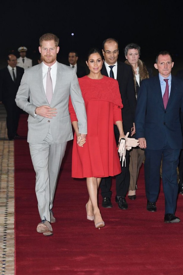 Meghan nổi bật với đầm đỏ rực rỡ đến từ thương hiệu Valentino. Đây là lần hiếm hoi nữ công tước xứ Sussex không diện đồ ôm sát mà mặc một chiếc đầm thoải mái. Nhưng việc Meghan vẫn trung thành với đôi giày cao gót, điều không được khuyến khích với phụ nữ mang thai ở tháng thứ 7.