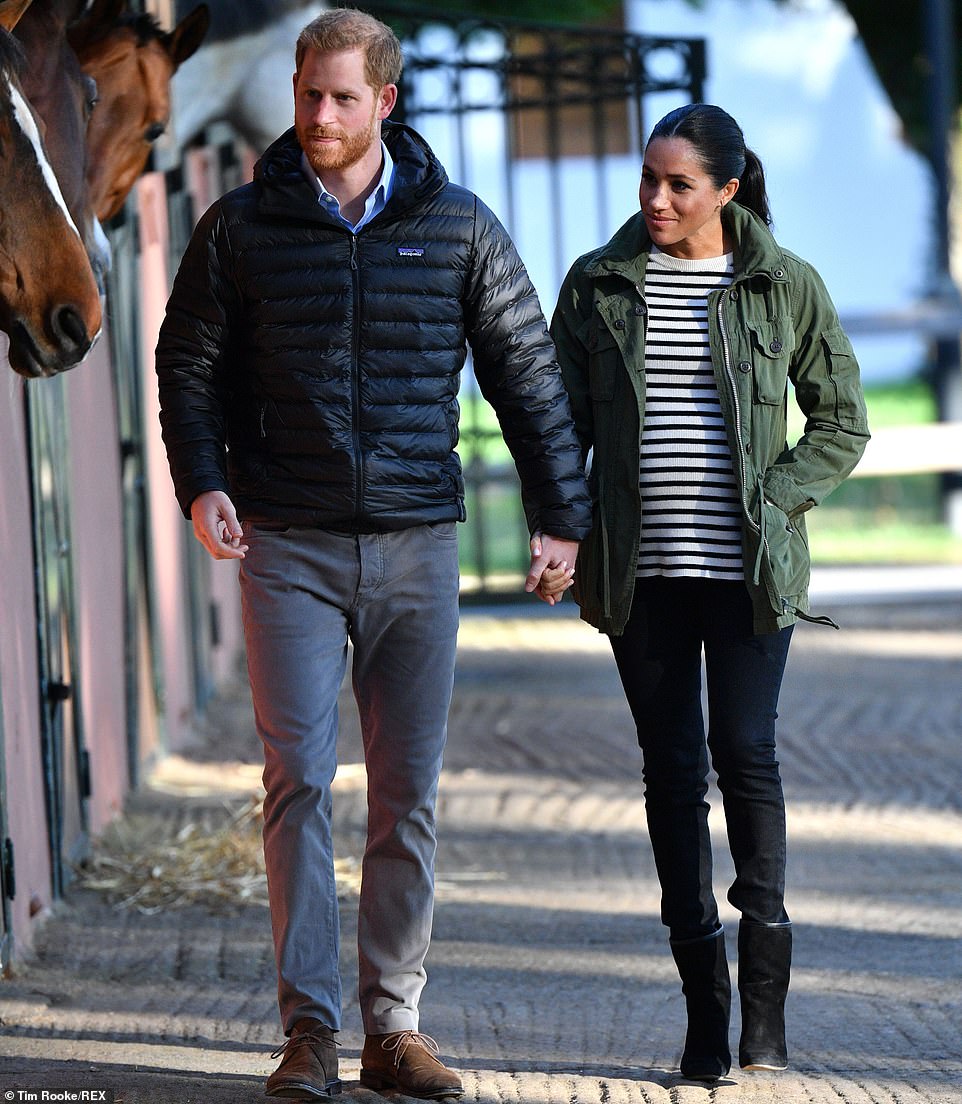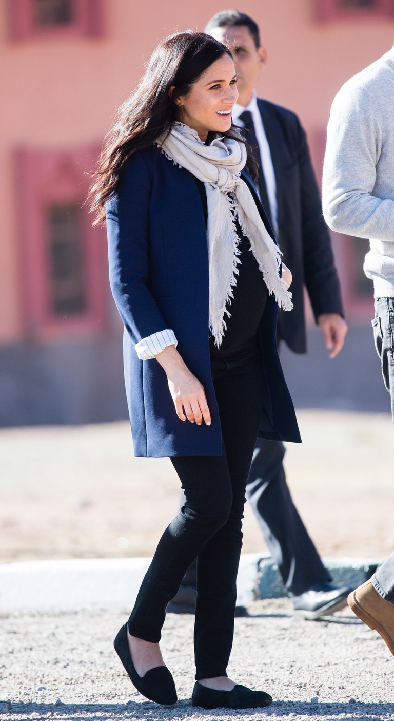 Meghan giản dị trong thiết kế áo len kẻ sọc từ hãng Equipment Breton, áo khoác ngoài style quân đôi từ J.Crew phối cùng quần ôm đen và giày boots của nhà mốt đình đám Stuart Weitzman.
