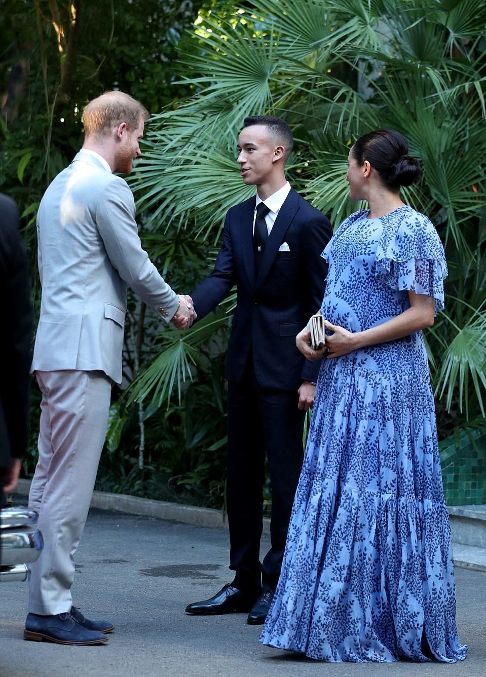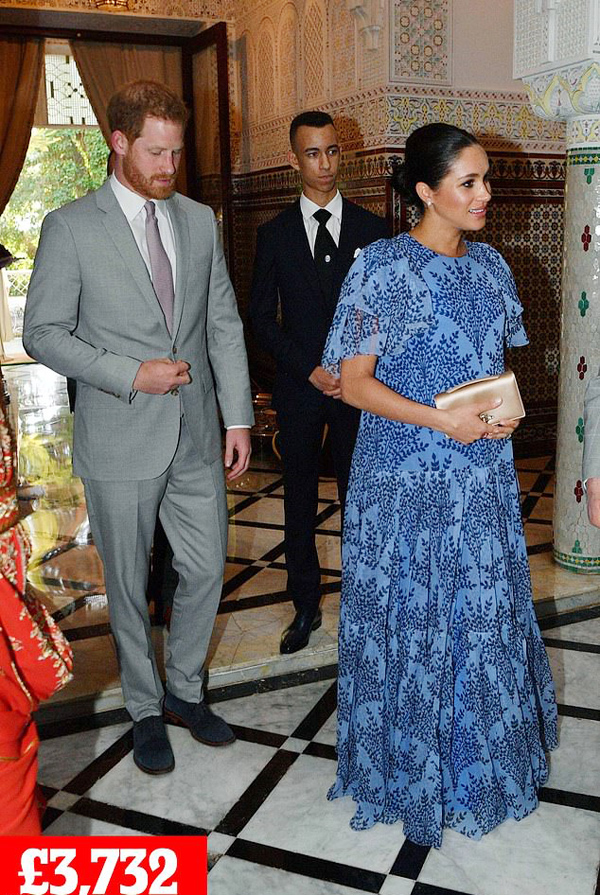 Buổi tối cuối cùng ở quốc gia Bắc Phi, Meghan chọn bộ váy maxi màu xanh bay bổng khi diện kiến Vua Mohammed VI và Thái tử Moulay tại tư dinh của quốc vương ở thủ đô Rabat.