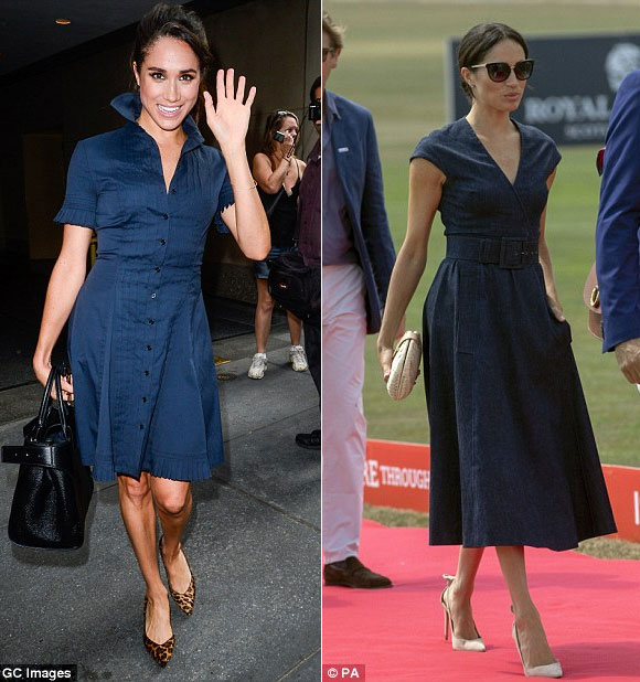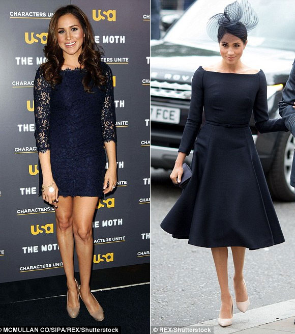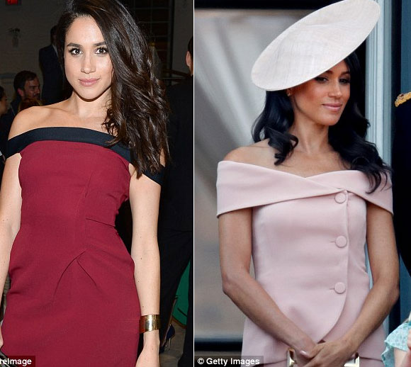 Meghan diện chiếc váy hiệu Yigal Azrouel (trái) ở thành phố New York, Mỹ năm 2016. Cùng với gam màu tương tự, cô lựa chọn thiết kế hiệu Carolina Herrera (phải) mới đây. Có thể thấy, style mới giúp cô vừa khoe được vòng eo thon lại vừa toát lên vẻ dịu dàng, duyên dáng