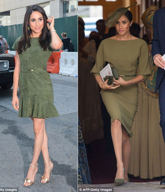 Cùng sắc màu nhưng chiếc váy màu xanh ô liu (phải) của Ralph Lauren giúp Meghan phô diễn nét đẹp quý tộc, hơn hẳn chiếc váy cô mặc hồi tham dự Tuần lễ thời trang New York năm 2013 (trái)