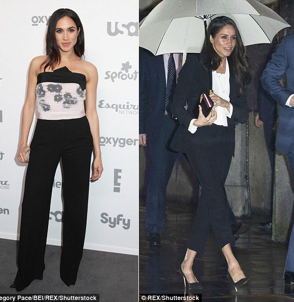 Khi trở thành vợ của Hoàng tử Harry, Meghan mặc bộ vest tối màu cùng áo trắng thanh lịch,