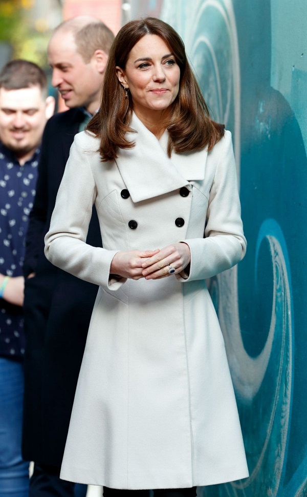 Kiểu áo trench coat màu trắng này được Kate mặc đi mặc lại rất nhiều lần, lúc xuất hiện trên phố tại đất nước Ireland. Bà mẹ ba con cũng diện lại bộ cánh này với gương mặt được makeup nhẹ nhàng và kiểu tóc buông xõa yêu kiều
