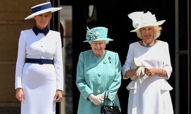 Melania Trump và Nữ công tước xứ Cornwall Camilla diện cùng tông màu trang phục trắng muốt khi xuất hiện tại Cung điện Buckingham