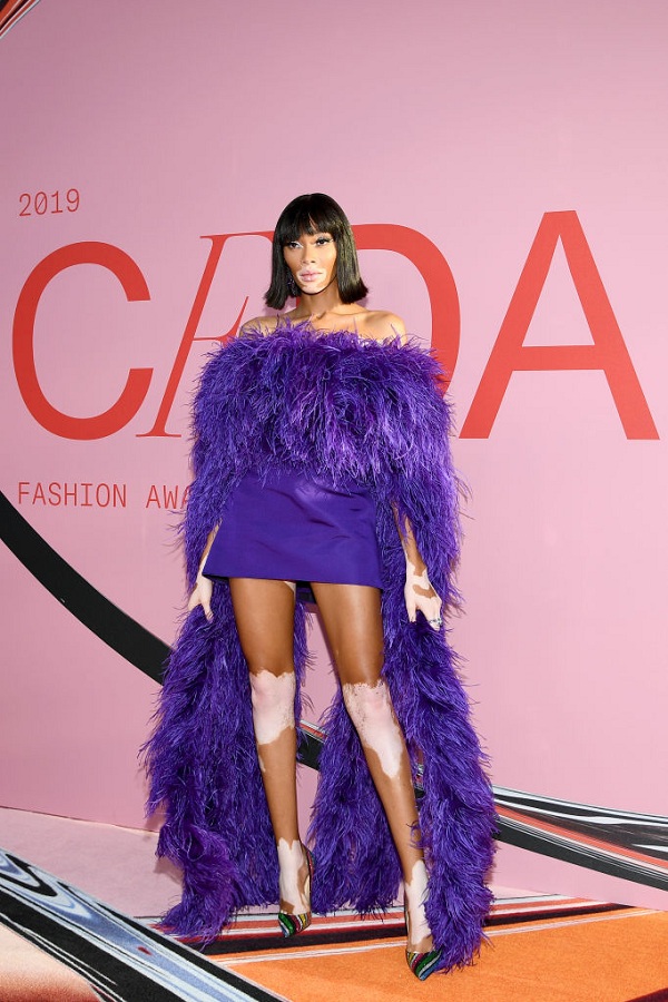 Nàng mẫu bạch biến Winnie Harlow lạ lẫm trong thiết kế lông vũ tím lịm từ Christian Siriano.