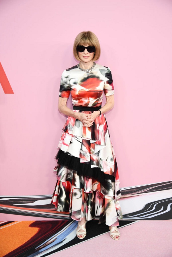 Tổng biên tập Tạp chí Vouge Anna Wintour trong chiếc váy ombre đen đỏ xếp tầng cùng style mắt kiếng đen đặc trưng trên thảm hồng tại CFDA