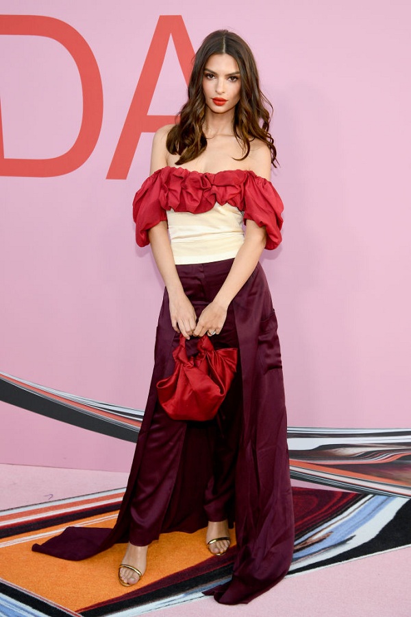 Nàng mẫu nội y instagram đình đám Emily Ratajkowski khác hẳn với style hở hang thường thấy, ngược lại cô chọn cho mình trang phục bèo nhún màu đỏ đô pha trắng vô cùng nữ tính trên thảm đỏ