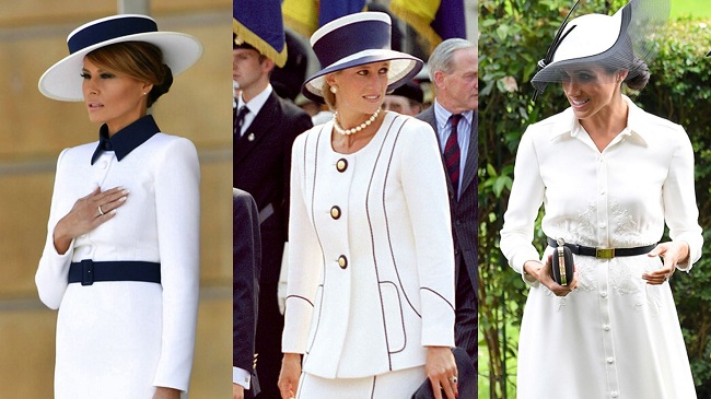 Đệ nhất phu nhân Tổng thống Mỹ Melania Trump khoác trên mình thiết kế váy của Dolce & Gabbana với điểm nhấn là thắt lưng và cổ áo màu xanh hải quân, phối cùng phụ kiện là chiếc mũ được đánh giá là giống cố Công nương Diana trong ngày bà gặp Nữ hoàng Anh.