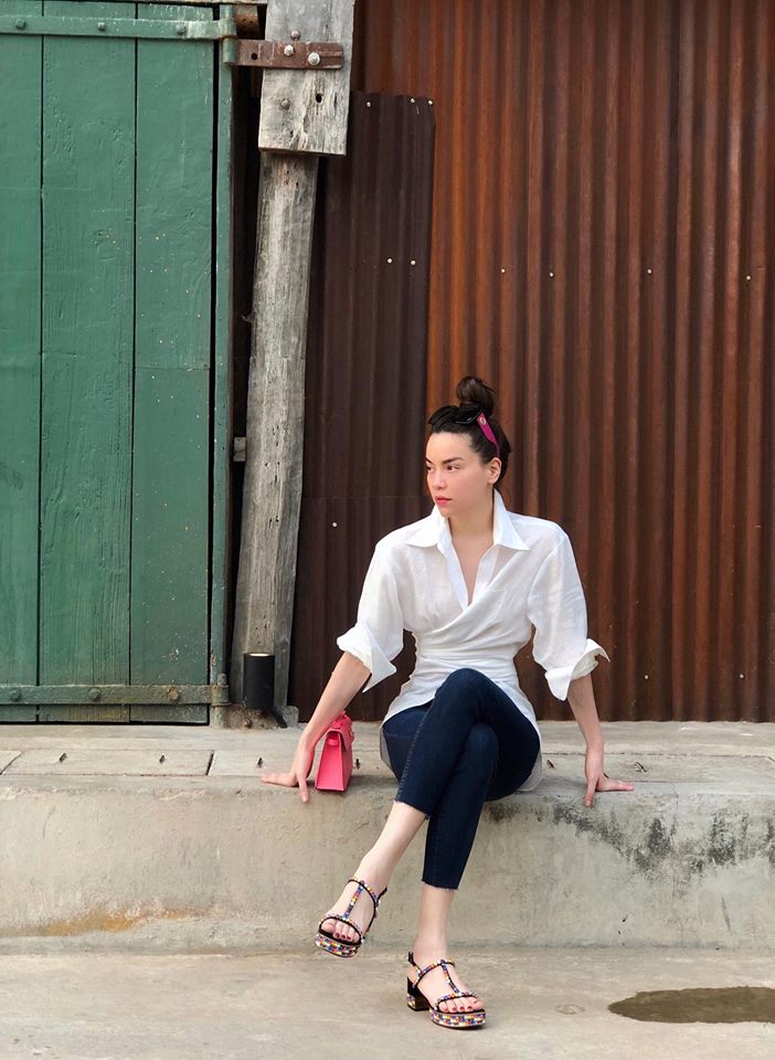 Sơ mi trắng trơn dáng rộng thường được Thanh Hằng kết hợp với jeans đen cực basic.
