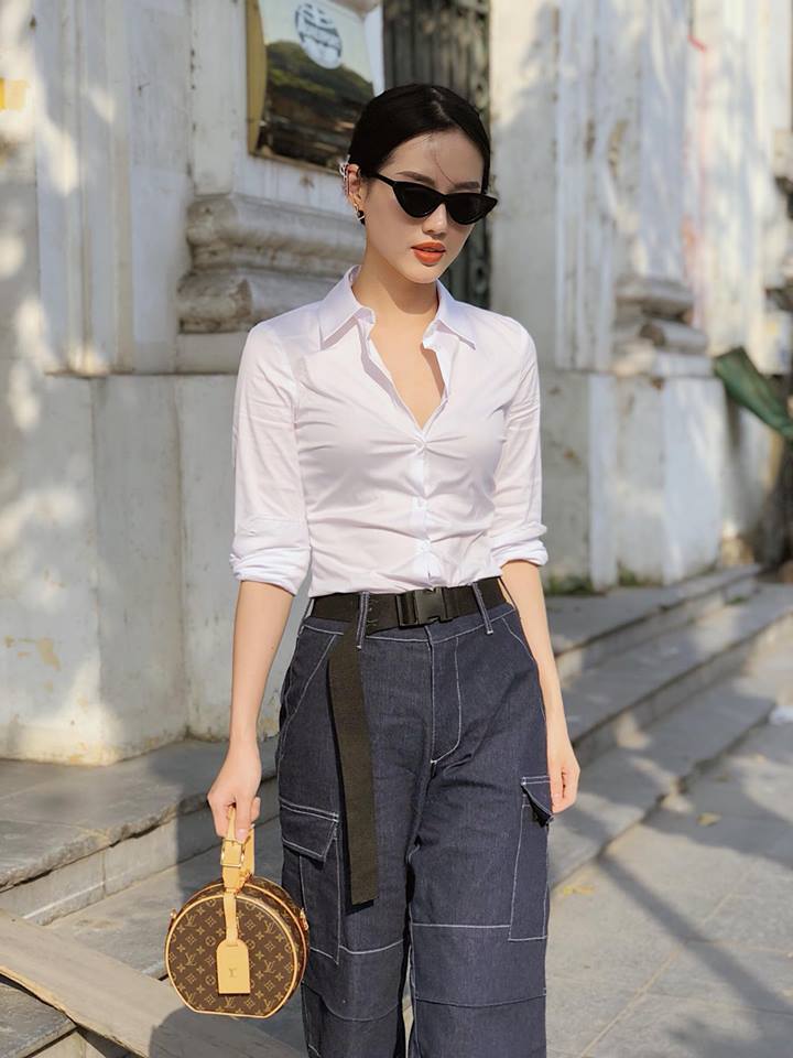 Trong bức hình mới nhất khoe outfit, Minh Hằng diện áo sơ mi tay bồng đang là hot trend, kết hợp với jeans rách cực kỳ bụi bặm. Chiếc túi Louis Vuitton của Minh Hằng cũng là items được nhiều người đẹp ưa chuộng.