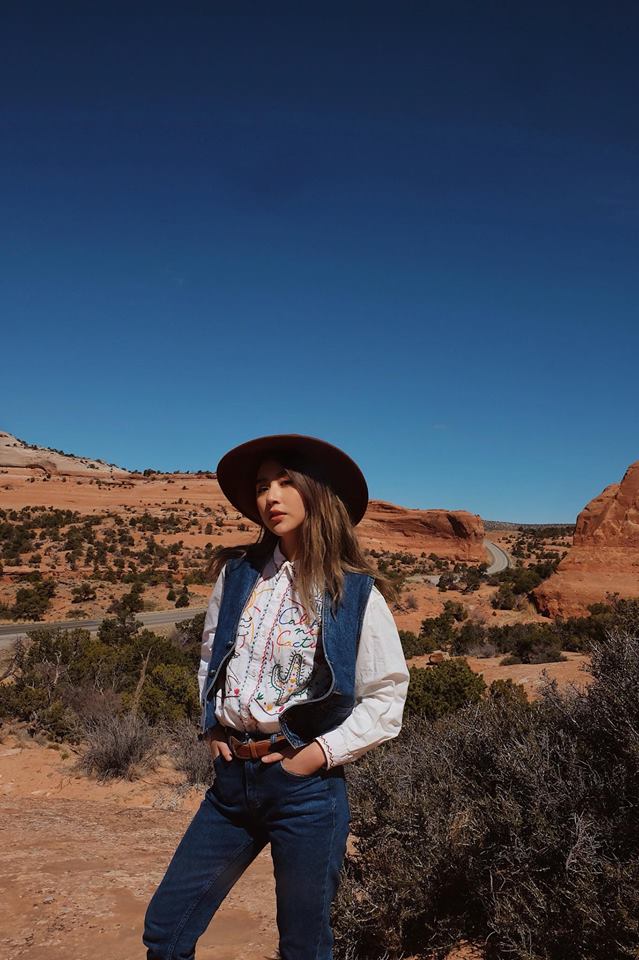 Quỳnh Anh Shyn đang có những ngày vi vu trên đất Mỹ. Cô nàng khoe outfit cực hợp với mỗi vùng đất đặt chân đến. Trong bộ quần áo của những chàng cowboy, Quỳnh Anh khoe chiếc áo sơ mi trắng được thêu họa tiết xương rồng và chữ cực lạ mắt.