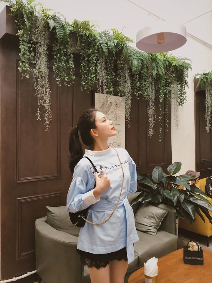 Áo buộc vạt cũng đang được các cô gái rất yêu thích. Khánh Linh chọn kết hợp màu trắng và nâu, hai gam màu đi với nhau luôn đảm bảo đẹp.