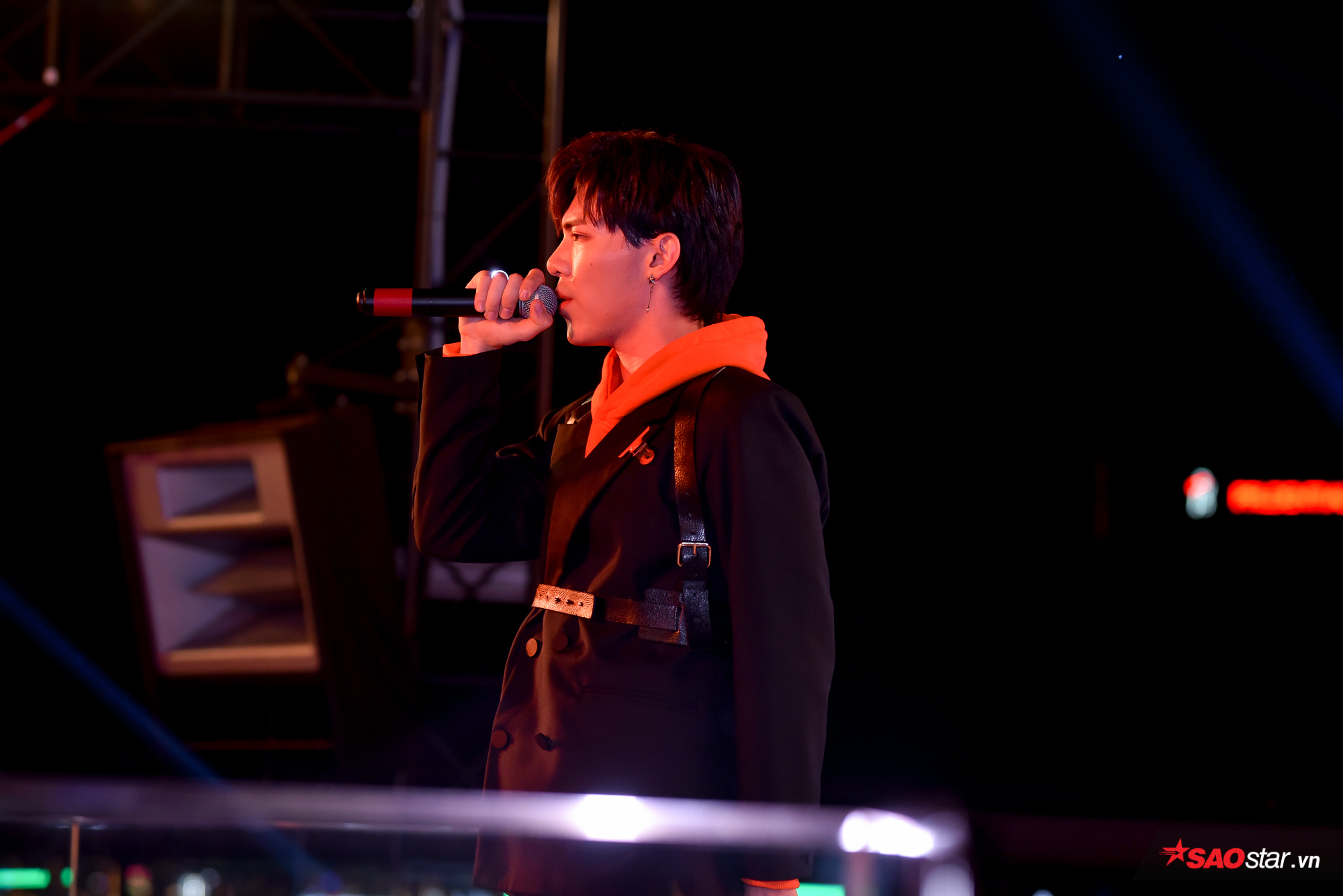 Erik đem đến outfit cá tính khi phối layer áo vest cùng hoodie tông cam.