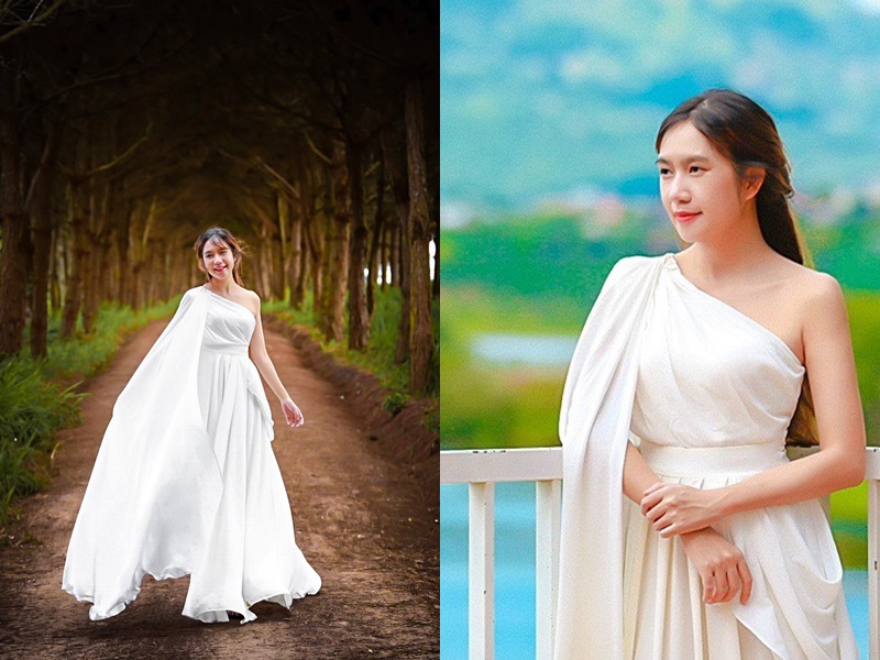 Minh Hà đẹp như nữ thần với đầm trắng lệch vai