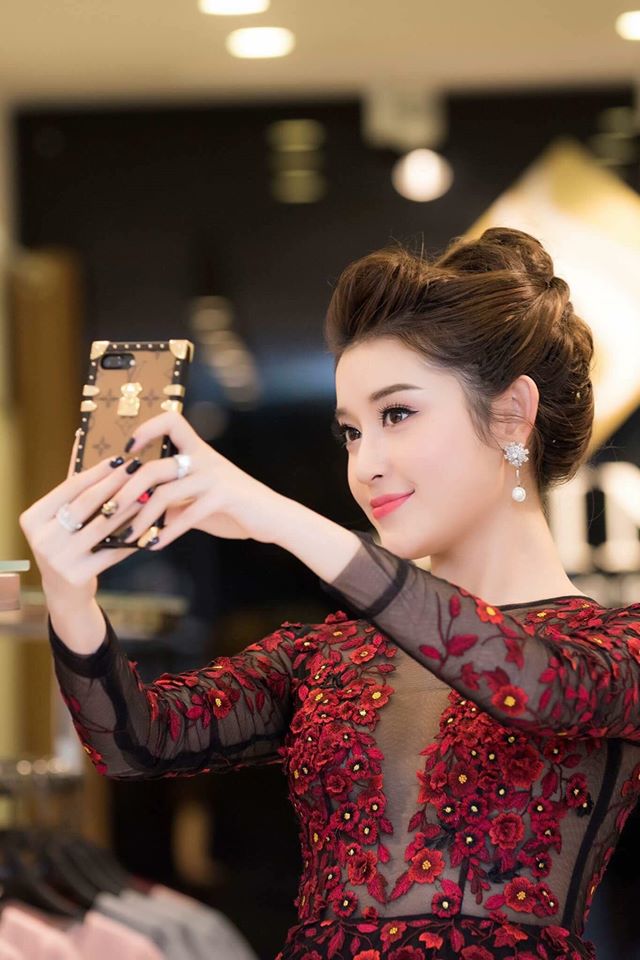 Minh Hằng “khoe” case điện thoại hiệu của mình.