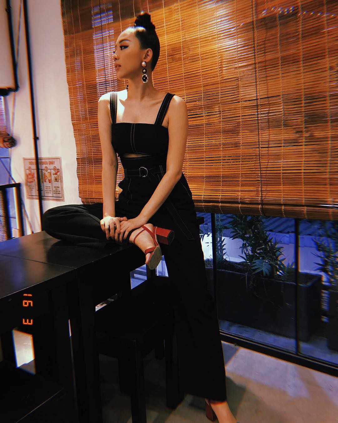 Với cả bộ cánh tông đen, Tóc Tiên đã khá tinh ý khi sử dụng phụ kiện giày cao gót đỏ làm điểm nhấn. Ngoài ra, phải cộng thêm điểm cho cô nàng bởi cách bới tóc cao, đeo hoa tai bản lớn giúp khuôn mặt thêm phần sáng sủa.