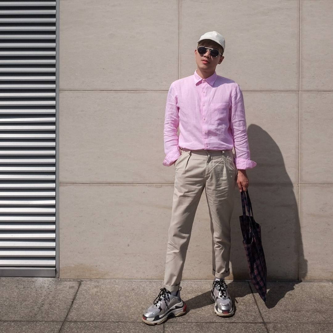 Lê Minh Ngọc có cách phối khá hay với áo sơ mi hồng chất liệu linen cùng quần kaki nâu và giày Balenciaga.