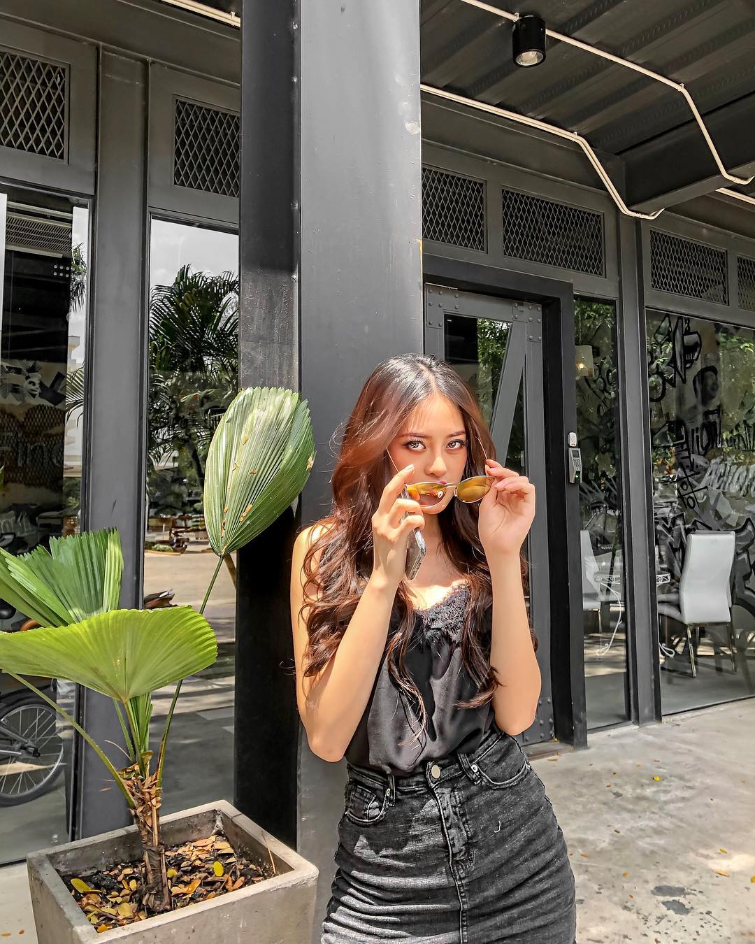 Diễn viên Thùy Anh khiến người qua đường phải ngẩn ngơ với ánh mắt cuốn hút, sắc lẹm. Kính mát gọng tròn, màu vàng khói được cô sử dụng như điểm nhấn nhá chính của set đồ.