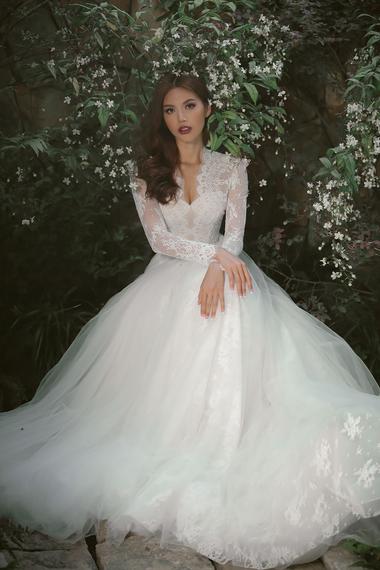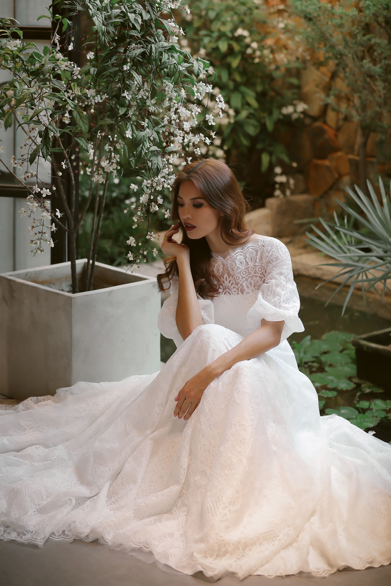 Đúng như những gì bộc bạch trước đó rằng muốn tạo nên các thiết kế đa dạng, hợp thời, bắt kịp xu hướng thời trang cưới cuối năm, NTK tiếp tục chinh phục giới sành mốt bằng kiểu đầm cưới cổ điển với tay lỡ bồng bềnh “cộp mác” tiểu thư, mang đến vẻ ngoài kín đáo, dịu dàng nhưng không kém phần gợi cảm. Đây cũng là một trong những xu hướng váy cưới được ưa chuộng nhất năm nay. Bên cạnh đó, nhờ kỹ thuật dựng phom corset là điểm mạnh của nhà mốt trẻ, bộ cánh giúp các cô dâu tôn lên vòng eo con kiến và đường cong ở hông đẹp mắt, thu hút mọi ánh nhìn xung quanh.