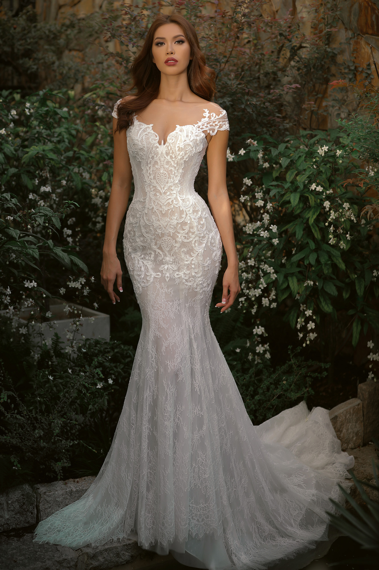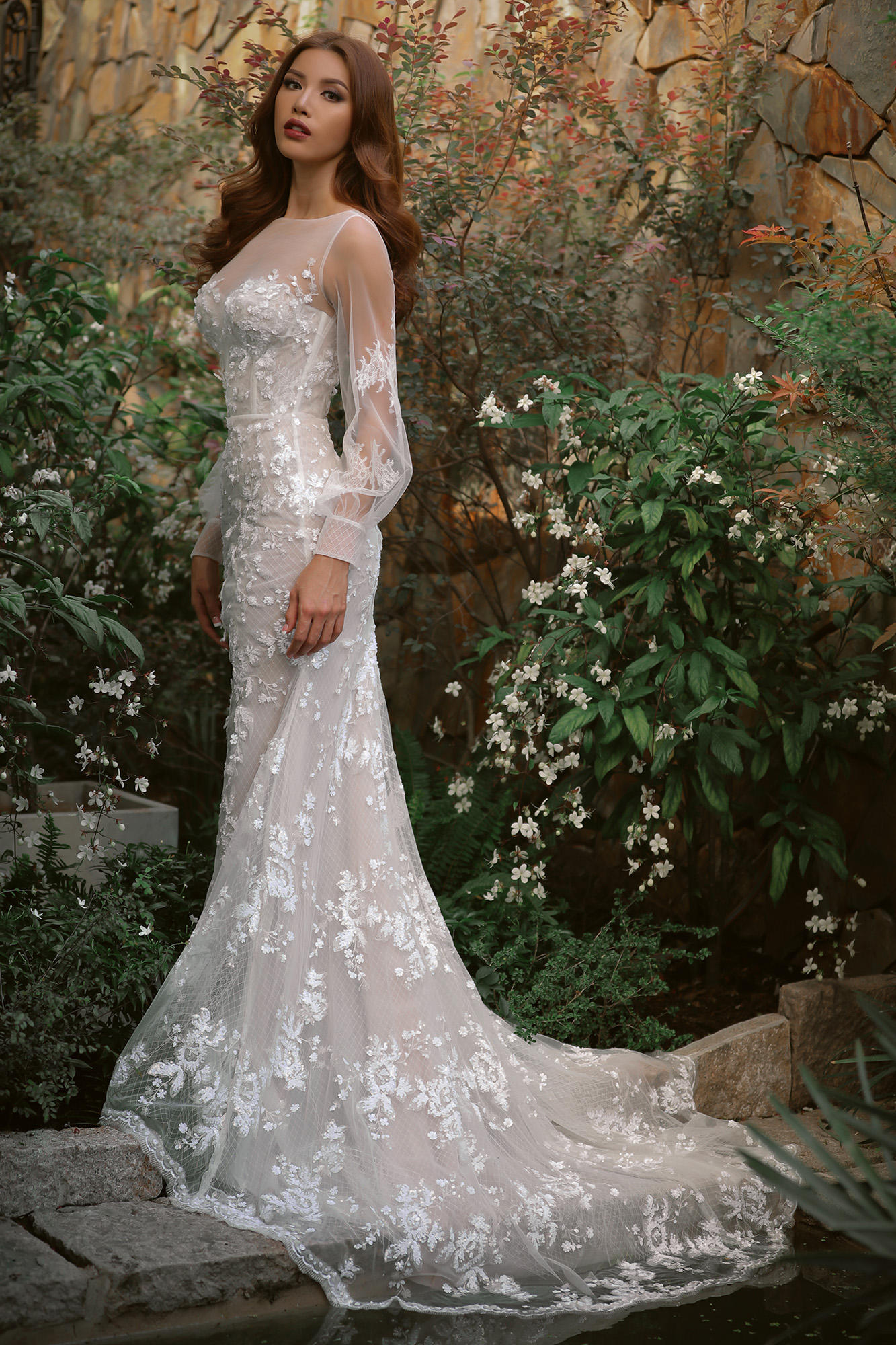 Không chỉ có chân váy xòe bồng, kiểu đầm đuôi cá gợi cảm cũng được NTK chú trọng và được cô thể hiện xuất sắc trong bộ ảnh lần này. Nhà mốt chọn tông trắng chủ đạo, làm nổi bật lên vẻ thanh tao, thuần khiết cho các nàng dâu tương lai.