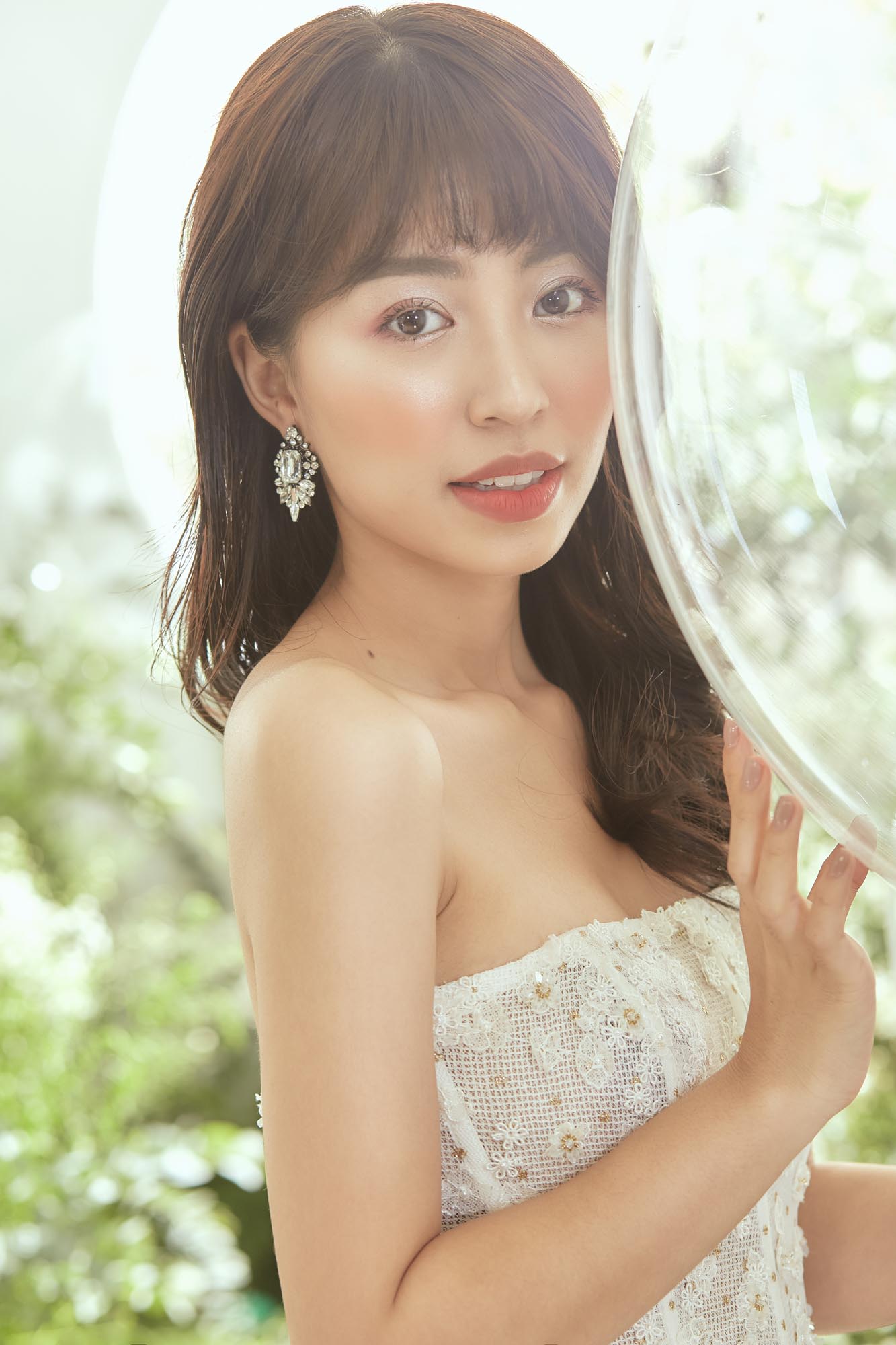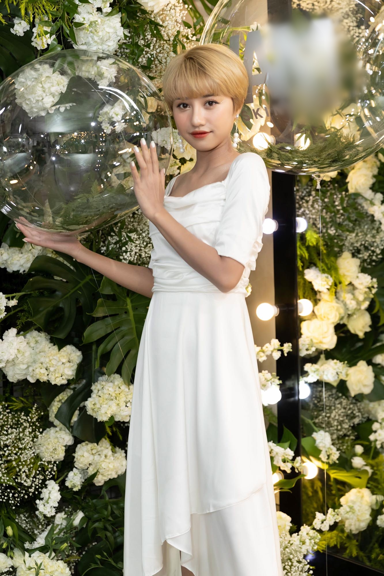 Thiên Nga như một nàng thơ trong trẻo giữa bối cảnh đầy hoa và bóng bay.