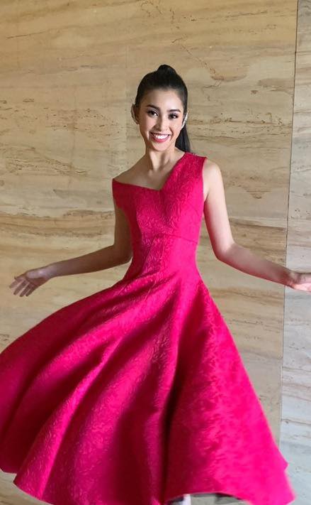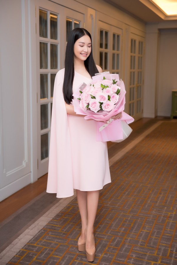 Tiểu Vy thu hút ánh nhìn người đối diện với bộ váy hồng ngọt ngào, cách tạo dáng “tung xòe” giúp cô nàng thể hiện rõ nét đẹp của chiếc váy.