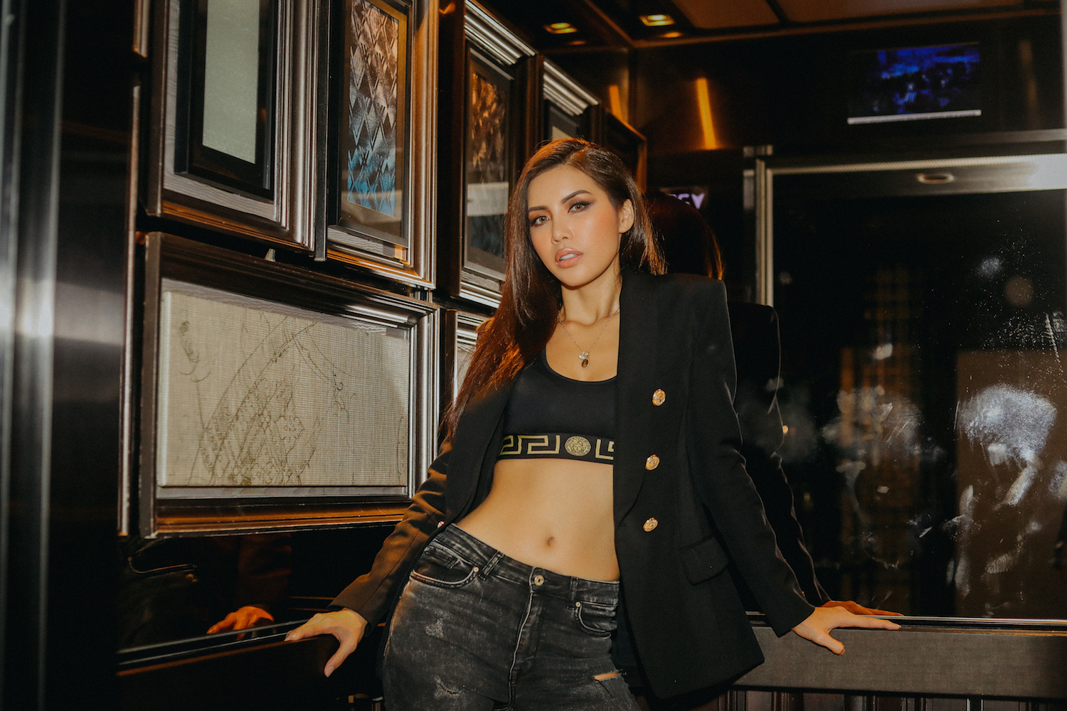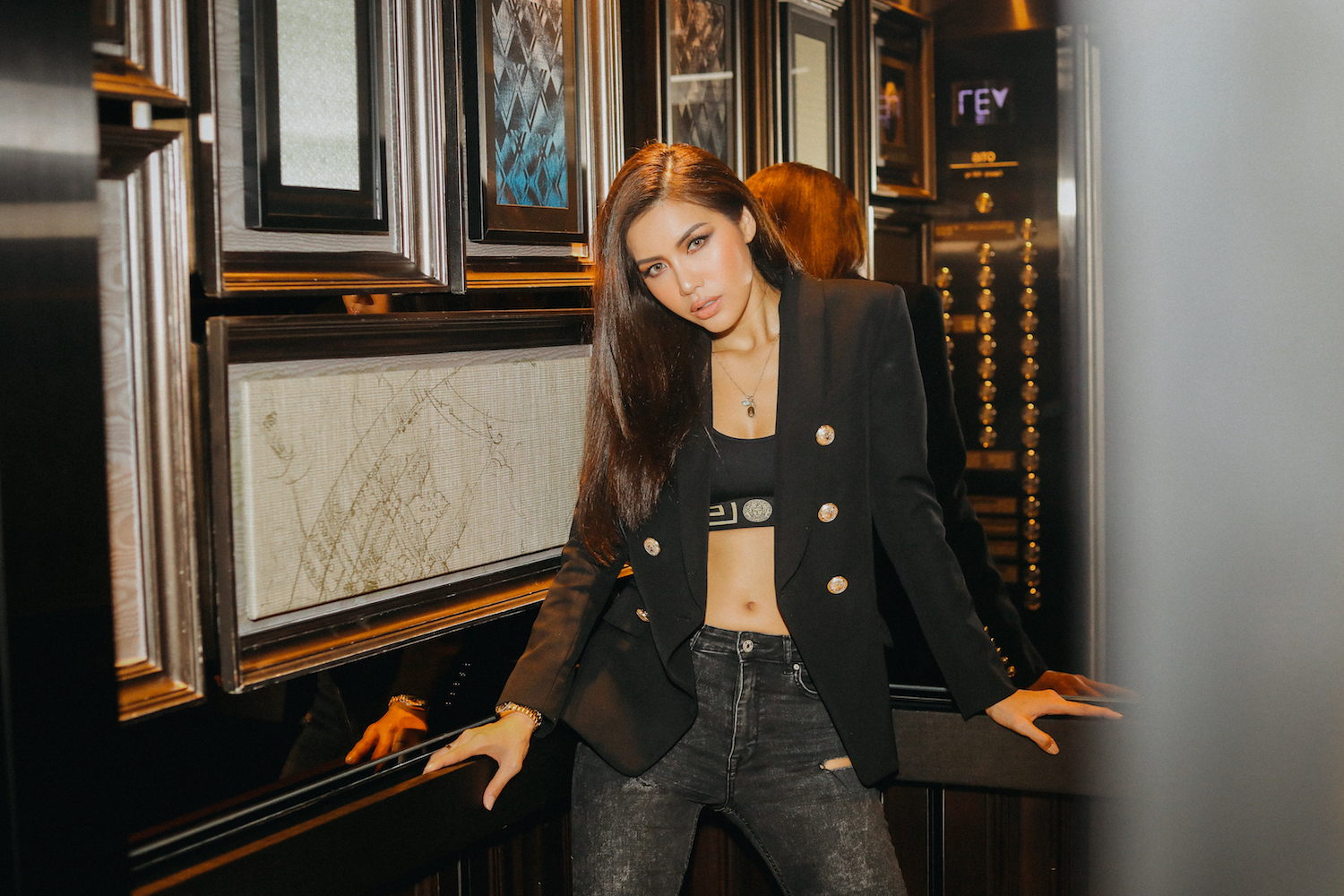 Áo crop top Versace phía trong kết hợp cùng áo vest khoác ngoài Balmain và quần jeans tối màu giúp chân dài khéo léo khoe được vòng eo săn chắc của mình.