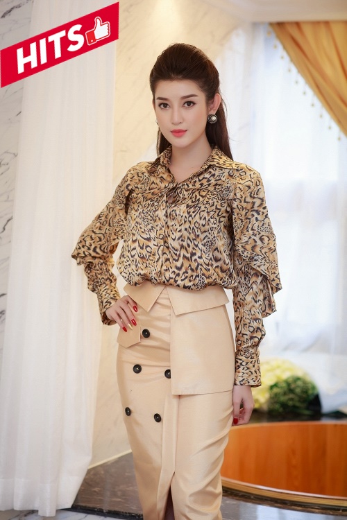 Á hậu Huyền My vô cùng xinh đẹp và hiện đại khi mix áo sơ mi lụa họa tiết da beo cùng chân váy dài màu nude với những điểm nhấn gấp nếp khá bắt mắt. Một tổng thể hài hòa giúp người đẹp dễ dàng chiếm được cảm tình của người nhìn.