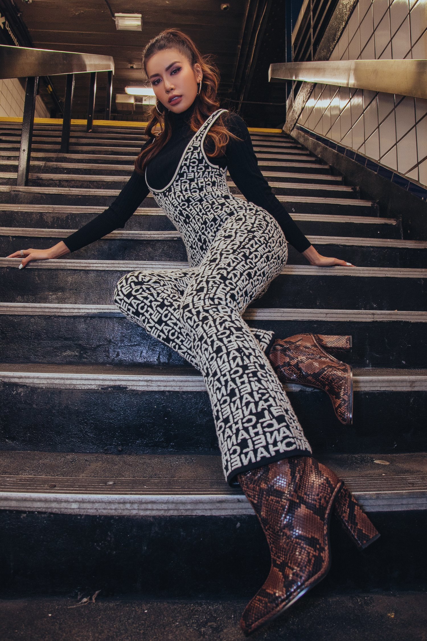 Mẫu jumpsuit Chanel hoạ tiết chữ được sắp xếp độc đáo, áo đen ôm tay dài phía trong kết hợp cùng đôi boots cao da rắn tưởng chừng như không ăn nhập gì với nhau nhưng lại hoàn toàn khiến giới mộ điệu thời trang phải gật gù bởi tinh thần và nét hiện đại.