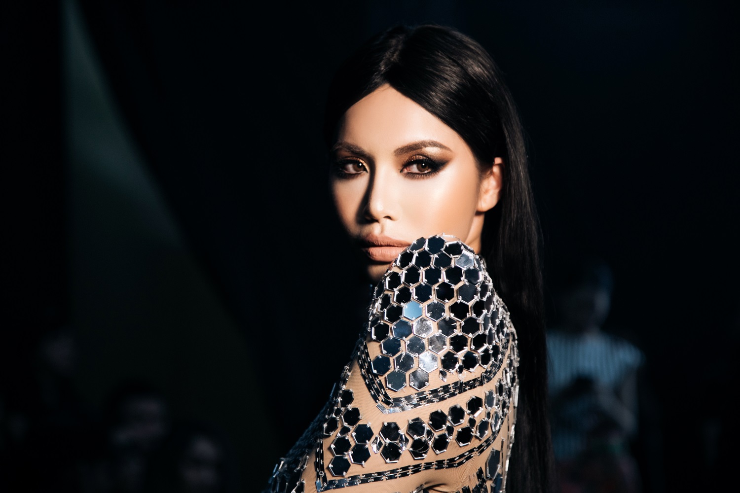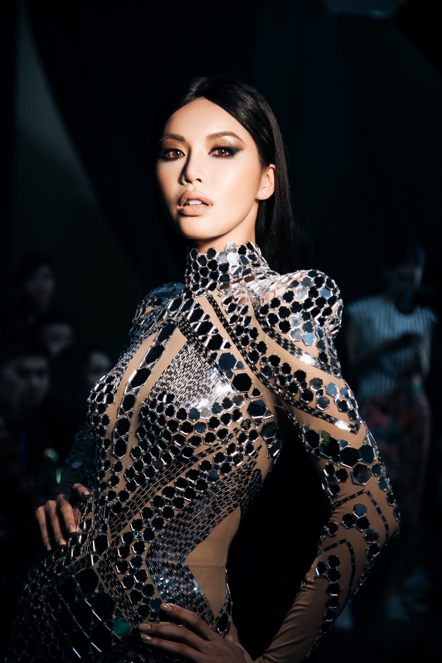 Mới đây, khi đảm nhận vị trí first face, mở màn cho một sự kiện thời trang, Minh Tú đã khiến dân tình hò reo không ngớt khi thể hiện một mẫu jumpsuit ôm sát, đính kết kim sa lấp lánh.