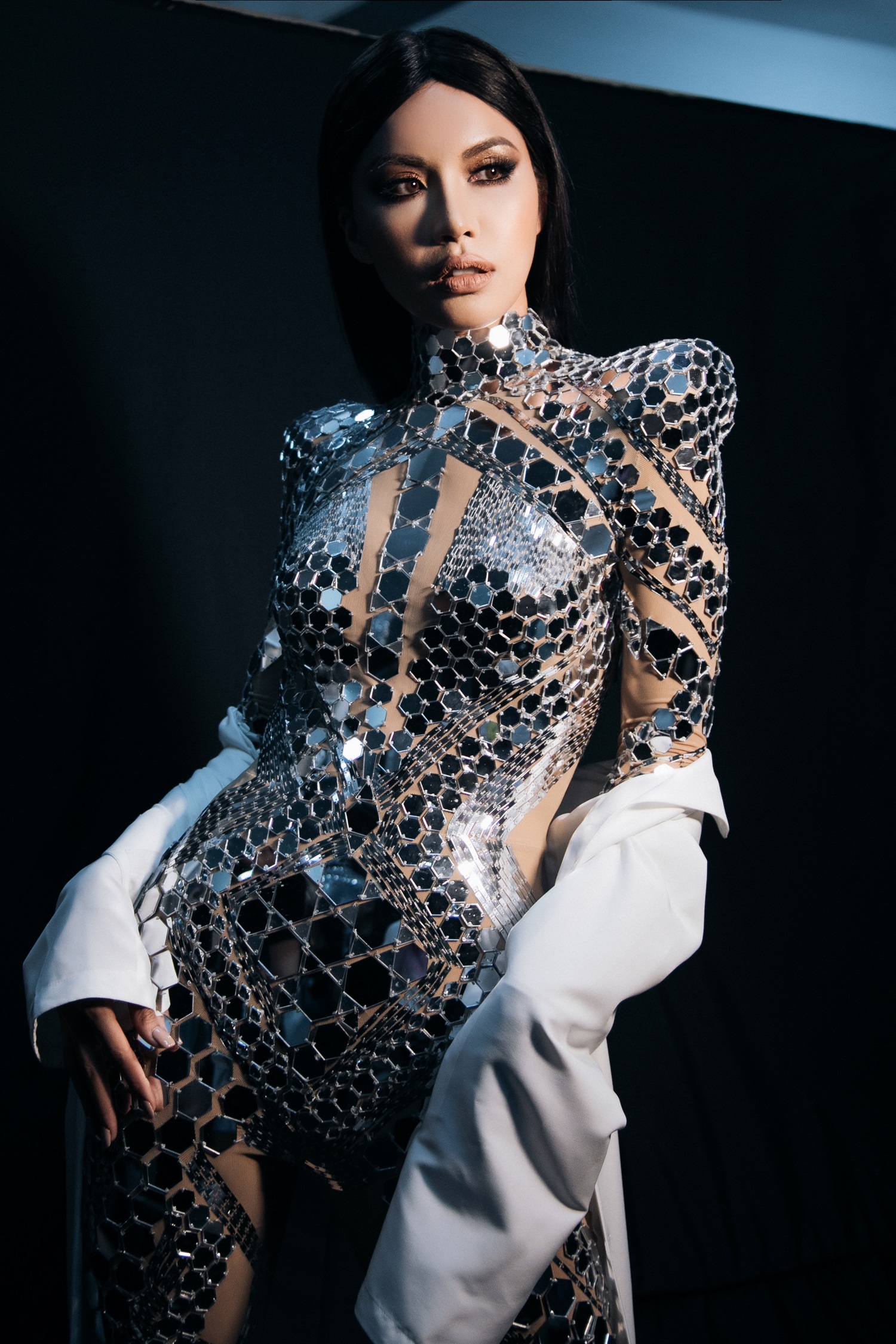 Cô nàng thể hiện một thiết kế jumpsuit ôm sát, đính kết sequin lấp lánh, tạo nên hiệu ứng phản quang khi có ánh sáng chiếu vào.