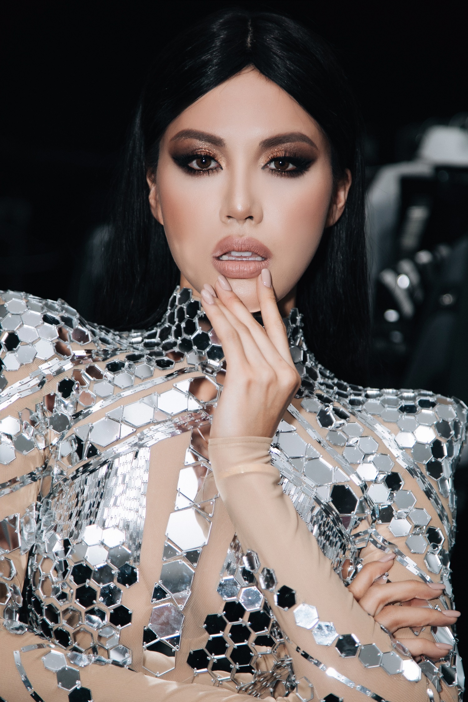 Gương mặt được trang điểm đậm, nhấn vào đôi mắt khói cùng kiểu kẻ mắt xếch rất ấn tượng.