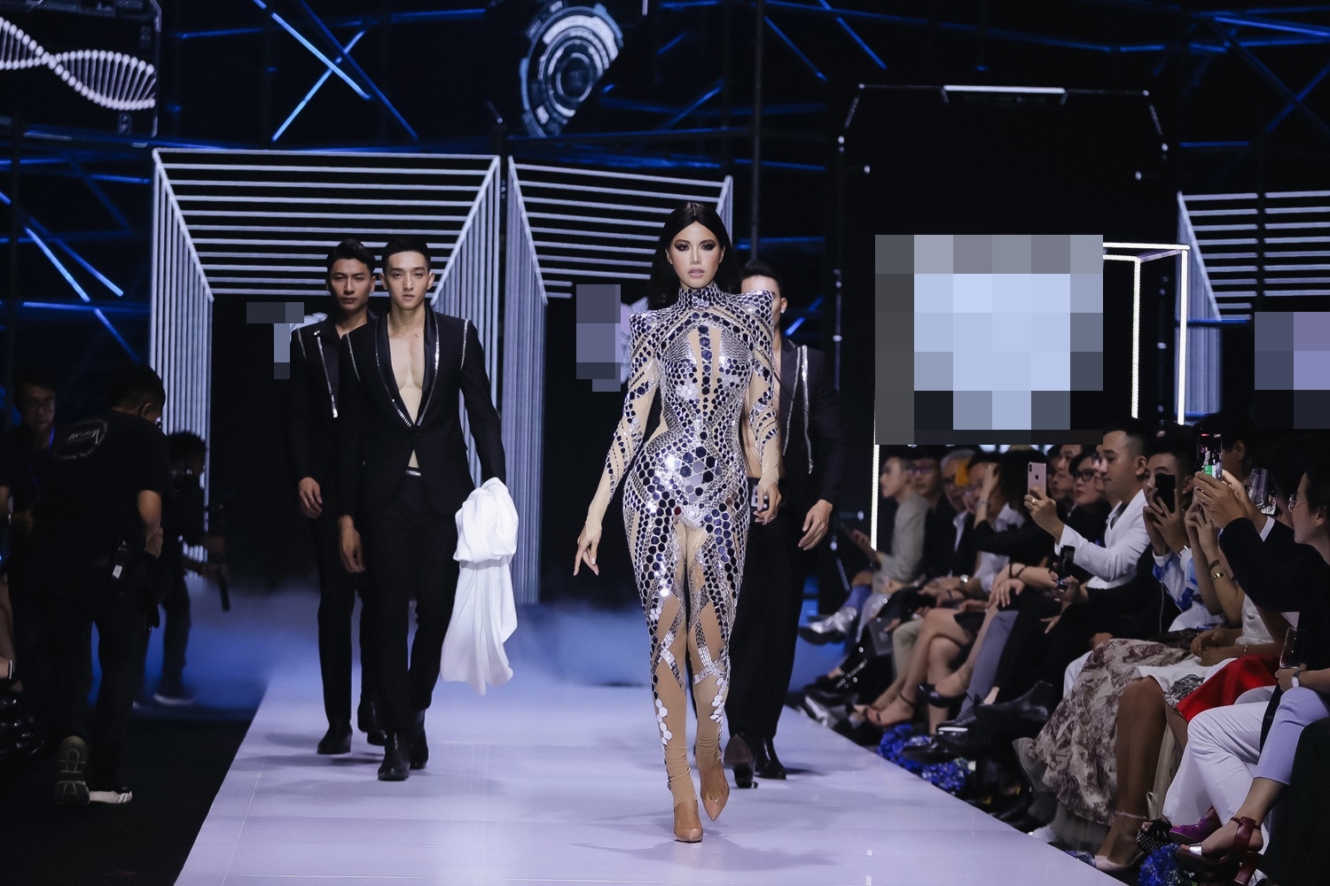 Những họa tiết gấp khúc góc cạnh dọc theo thân trang phục cũng thể hiện được tinh thần mạnh mẽ, độc đáo mà NTK muốn mang lại cho khán giả.