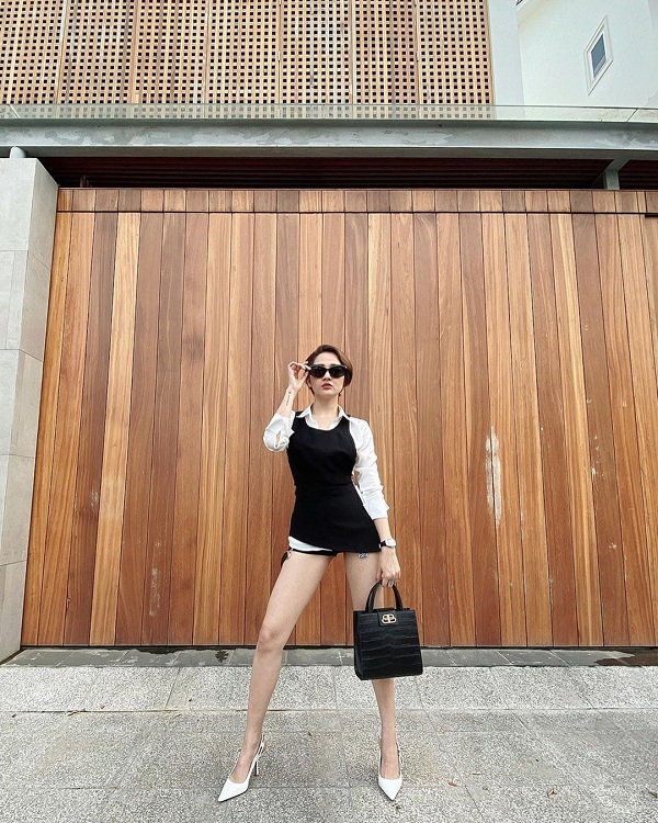 Phong cách matchy-matchy này cũng được nữ hoàng nội y Ngọc Trinh ưa chuộng trong khoảng thời gian gần đây khi cô ra phố. Áo sơ mi đen “mốt giấu quần” phối nền nã cùng túi Chanel mini và dép cao gót lưới