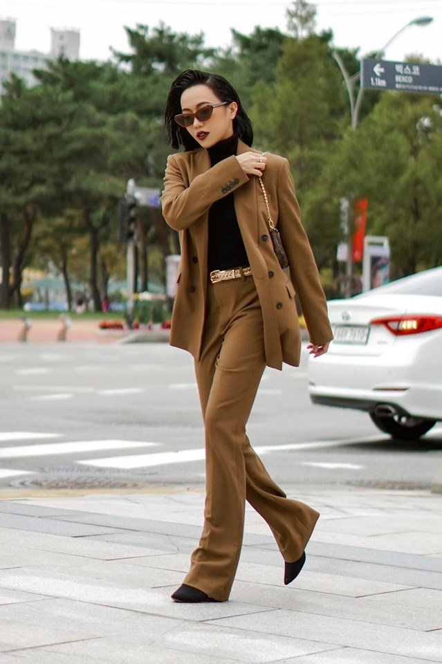 Du ngoạn tại Seoul, Hàn Quốc. Diệu Nhi khiến khán giả “ngỡ ngàng” trước phong cách thanh lịch, chất lừ với áo blazer nâu “ton sur ton” với quần nâu ống rộng phối cùng áo đen bên trong. Không những thế tone makeup cùng giày và túi xách cũng “hợp rơ” tông màu với tổng thể