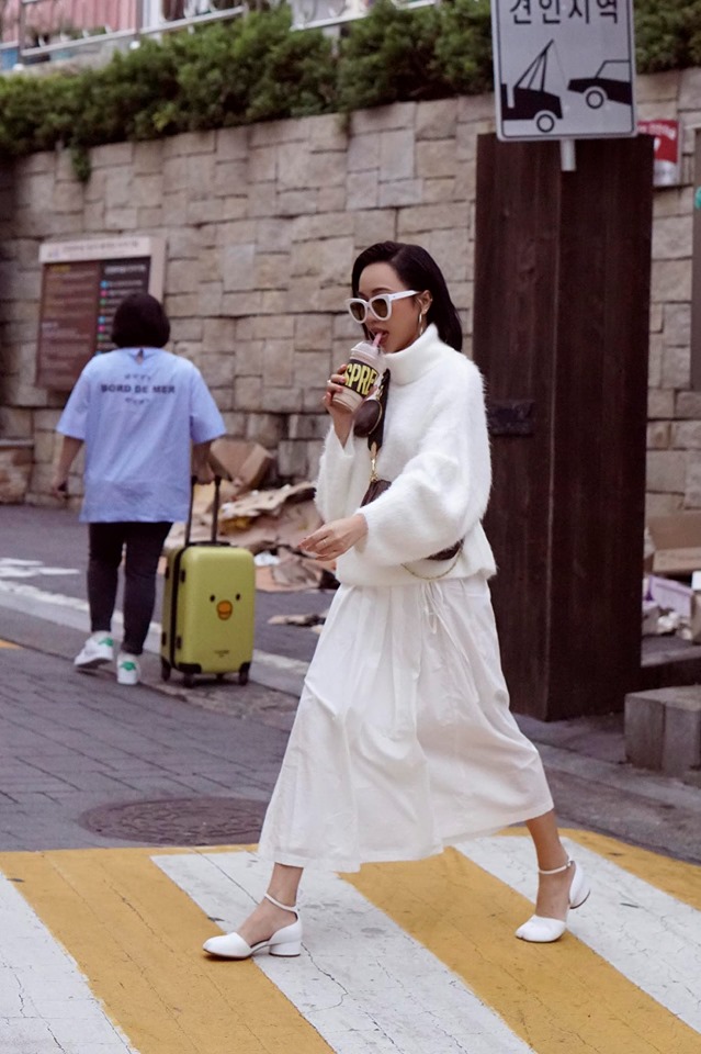 Diệu Nhi tiếp tục thu hút sự chú ý khi diện áo len cổ lọ trắng tất tần tật với váy suông dài cùng giày sandals cùng màu, style này khai thác được nét nữ tính của cô khi thực hiện bộ ảnh streetstyle ở nước bạn