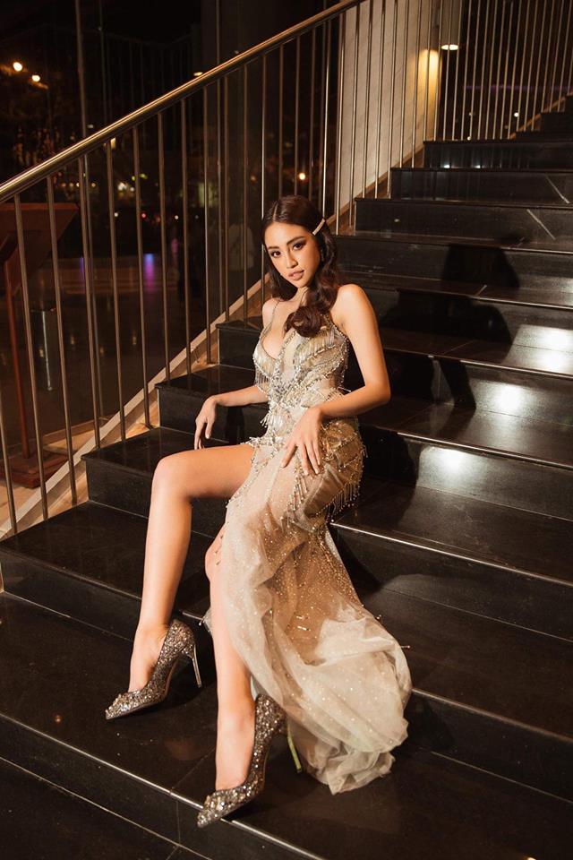 Nếu nhắc đến hai từ “nữ thần”, chắc chắn không thể bỏ qua Minh Tú/ Người đẹp xuất hiện cùng chiếc đầm dài gam màu đen ánh kim cùng kiểu tạo dáng xoạc chân cộp mác Anelina Jolie trứ danh.