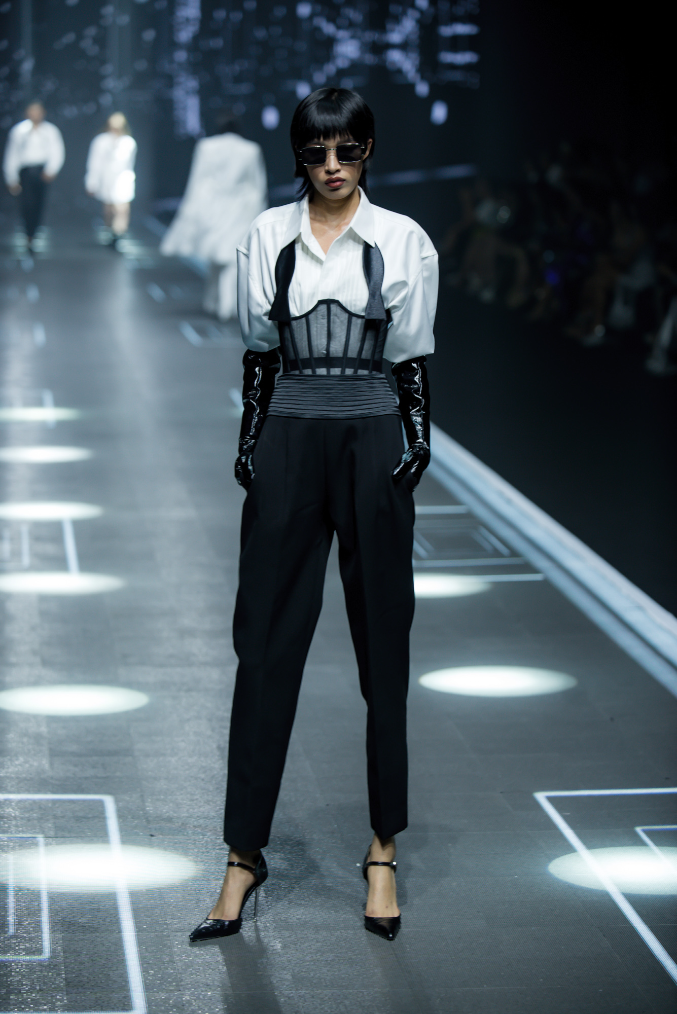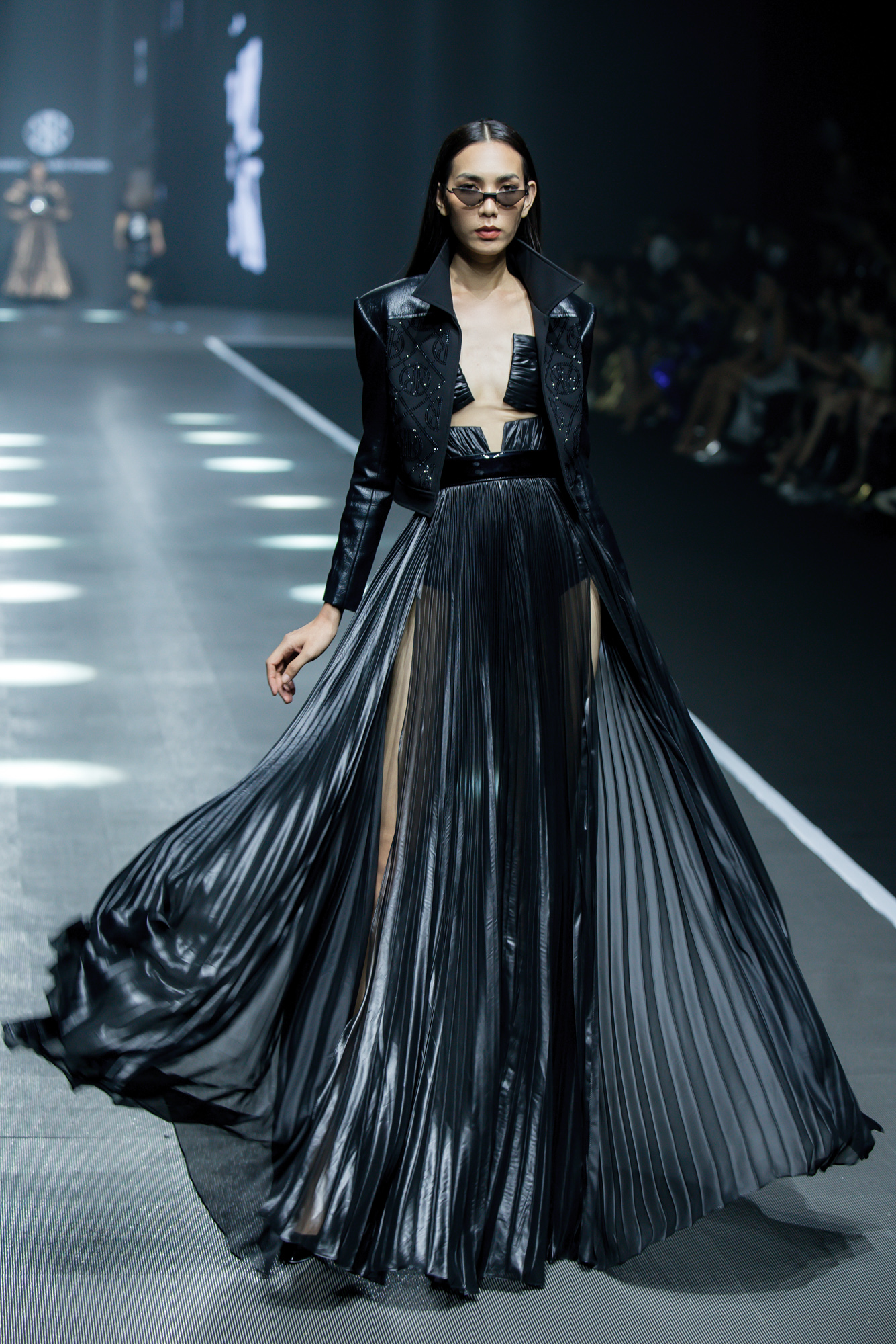 Trong lần trình diễn này, Minh Tú tiếp tục được khai thác tối đa lợi thế của mình với đôi chân dài miên man và vóc dáng hấp dẫn.