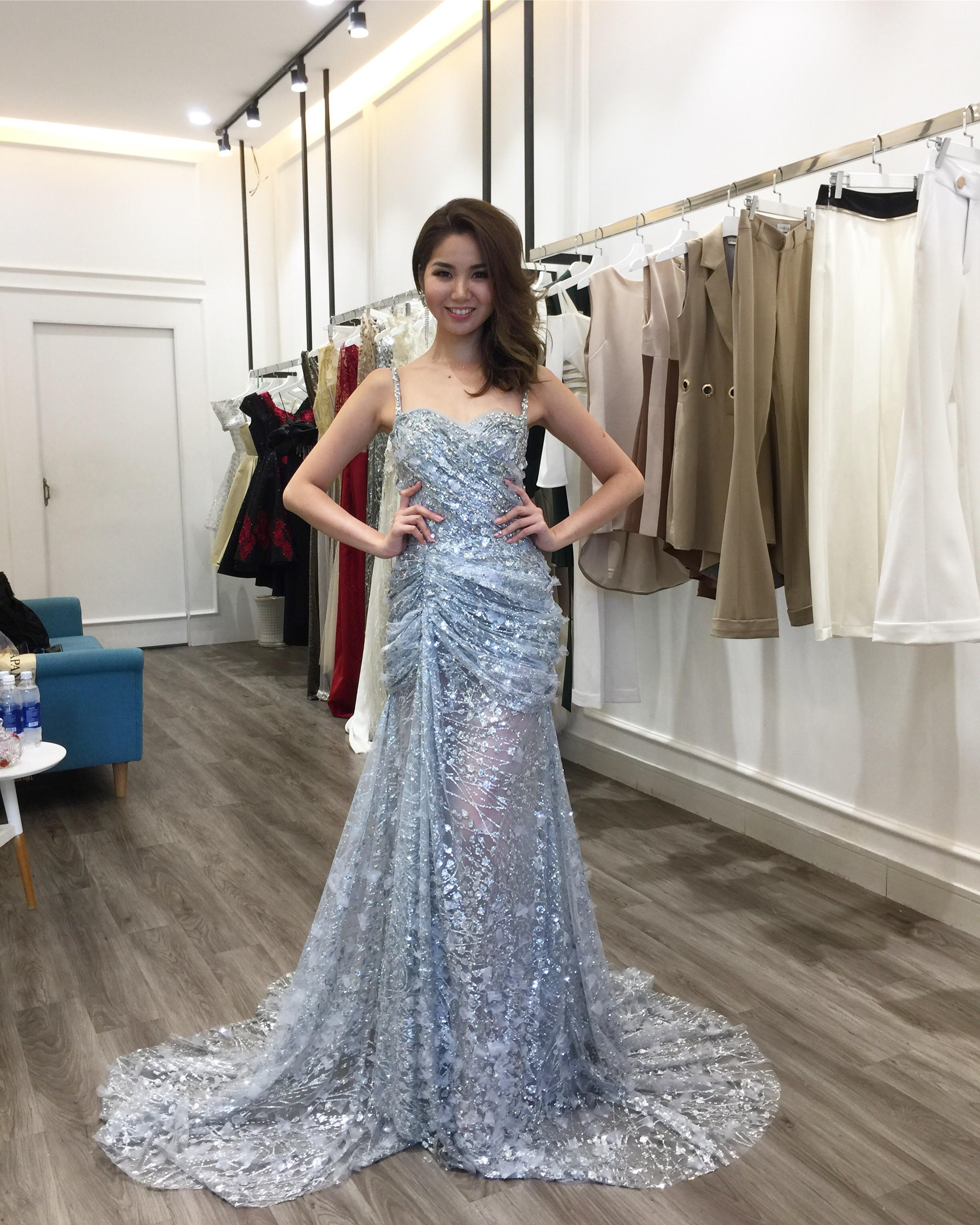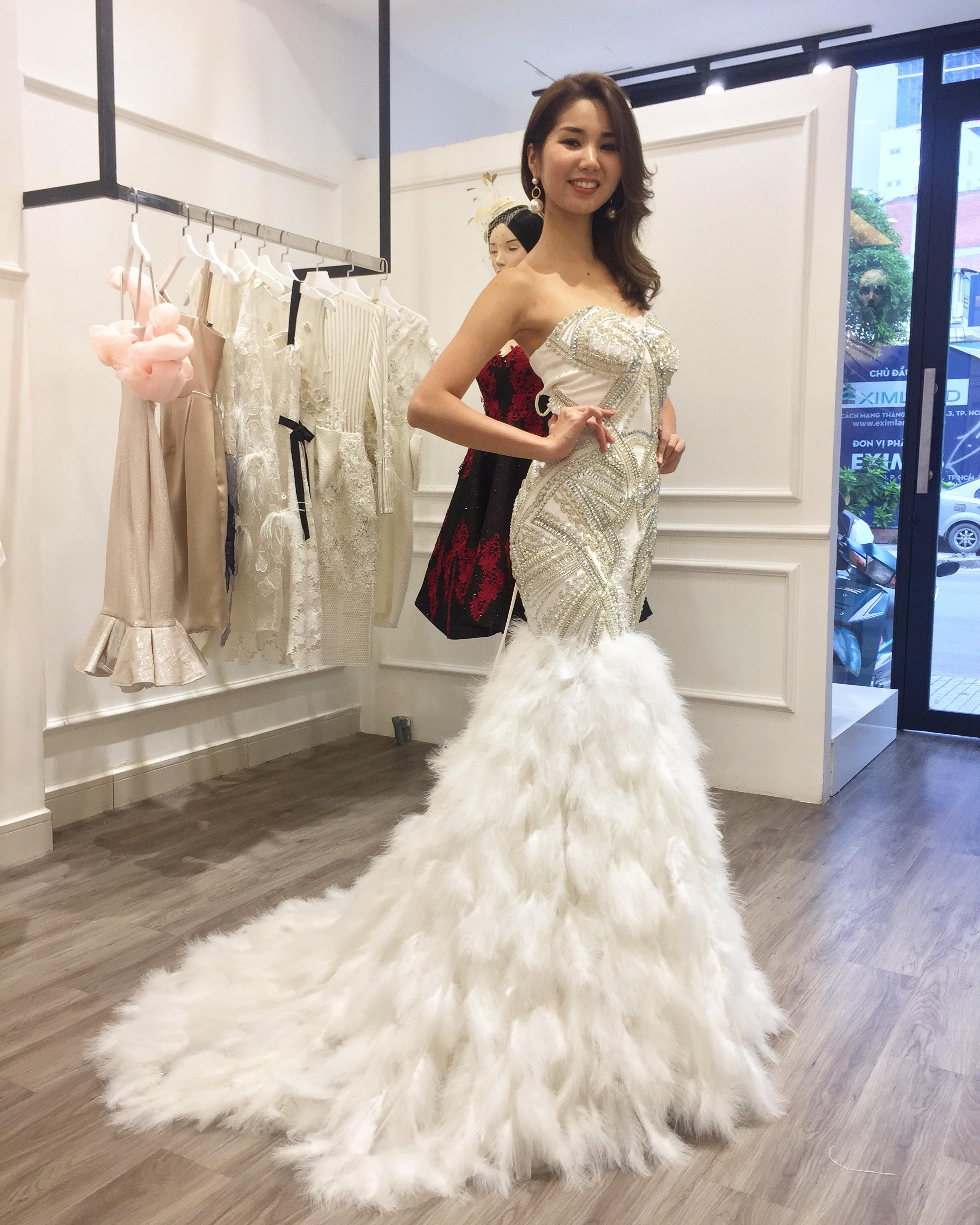 Cận cảnh bộ váy đuôi cá lộng lẫy mà Erika Tsuji sẽ mặc vào đêm chung kết 25/10 tới đây. Được đính kết tính tế bằng pha lê và lông vũ, Lê Ngọc Lâm chia sẻ, chiếc váy được làm gấp trong vòng 3 ngày với sự trợ giúp của 5 người thợ. Toàn bộ chi tiết được làm tỉ mỉ, kỹ thuật đính kết các loại đá cao cấp tạo ra các họa tiết hình học làm tăng hiệu ứng thị giác.