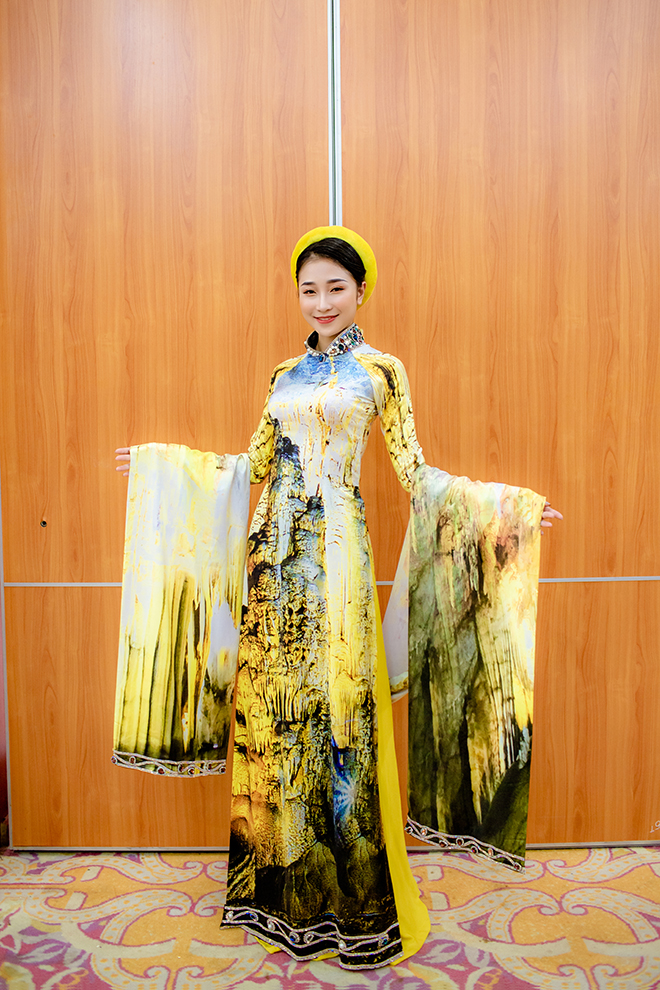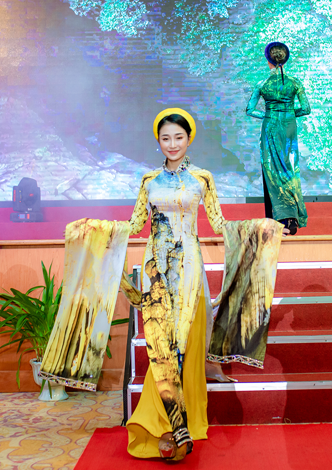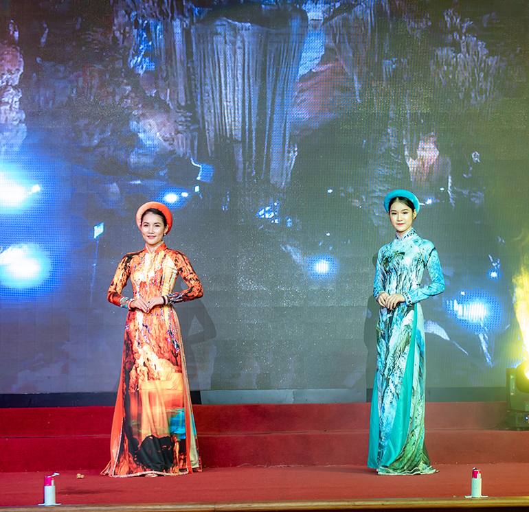Lấy ý tưởng từ động Thiên Đường - một trong những kỳ quan có một không hai trên thế giới nằm trong quần thể vườn Phong Nha Kẻ Bàng, hai NTK đã tạo nên những tà áo dài lung linh sắc màu đậm dấu ấn.
