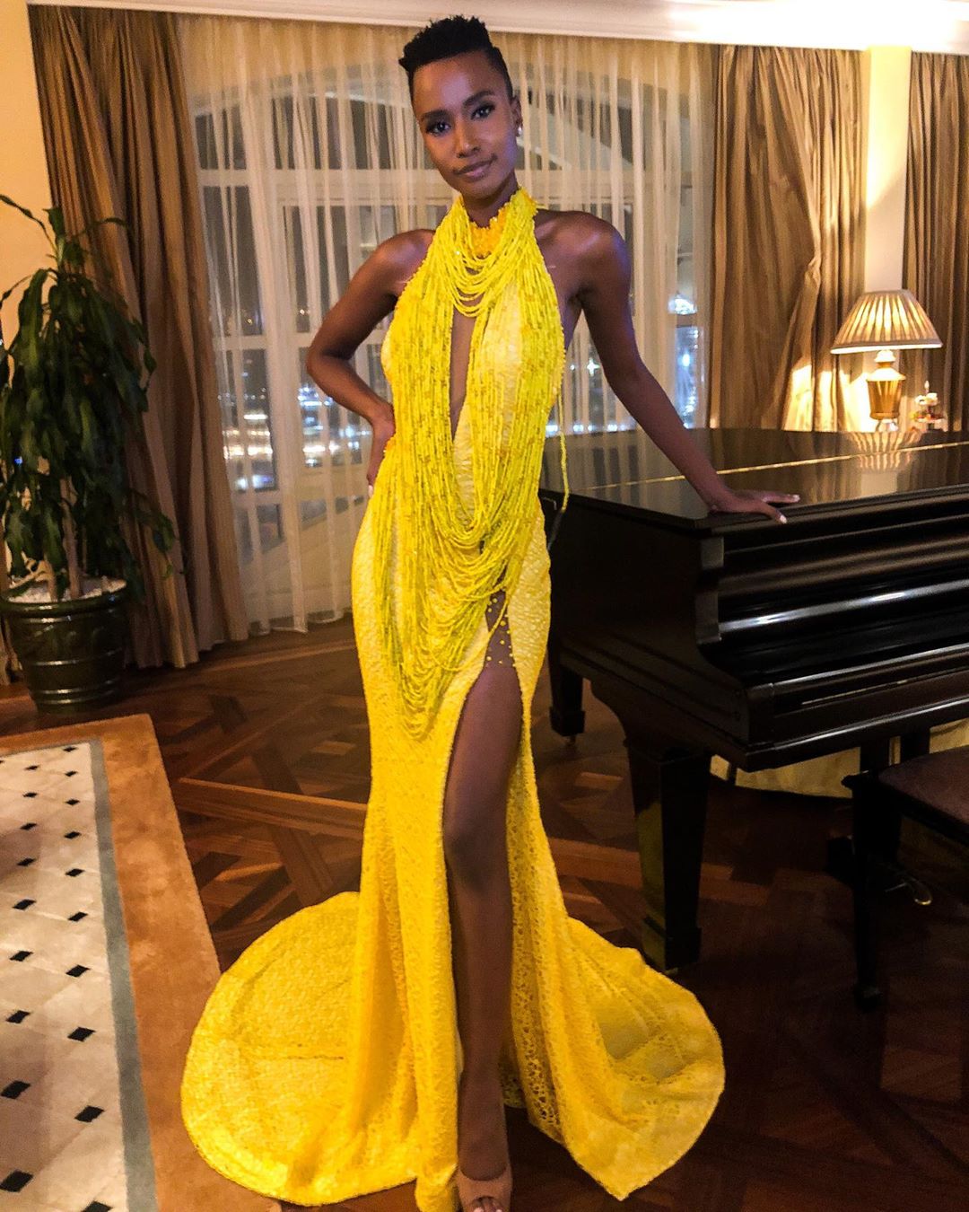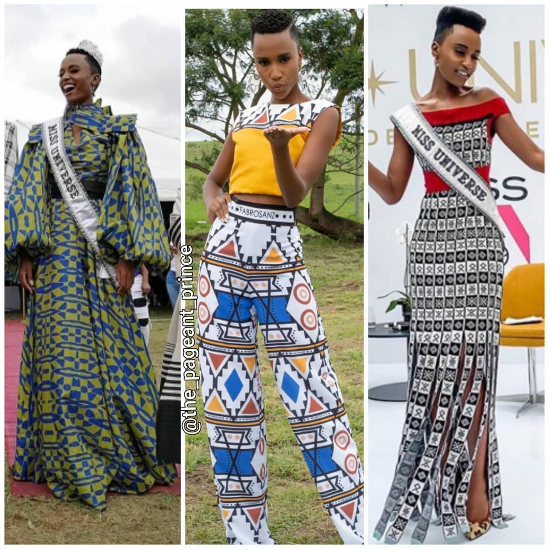 Có thể thấy, Zozibini Tunzi khá chuộng những màu sắc nổi, tương phản với màu da. Về họa tiết cô ưu tiên những họa tiết đặc trưng trong trang phục của người dân Nam Phi như caro, đối xứng…