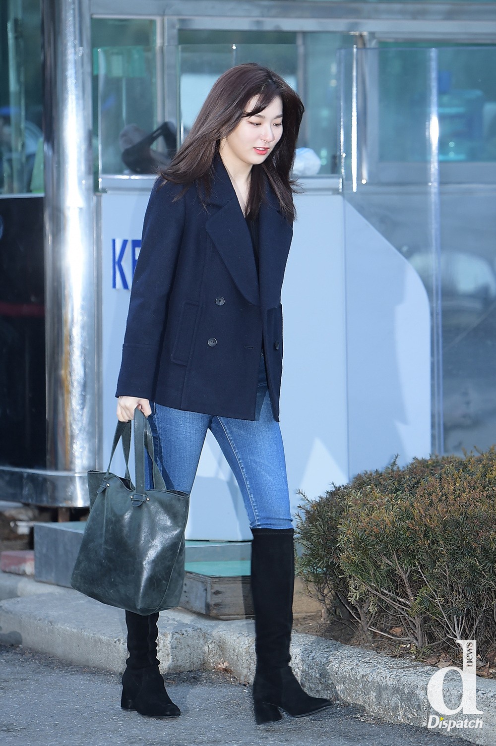 Các idol thường mặc váy ngắn khi diện kiểu boots này để chân trong dài và thon hơn. Nhưng nếu bạn thuộc tuýp thời-trang-không-phang-được-thời-tiết thì hãy ghi sổ phong cách của Seulgi (Red Velvet) nhé. Áo khoác, quần jeans và boots cao cổ là combo được Seulgi mặc thường xuyên khi đi làm.