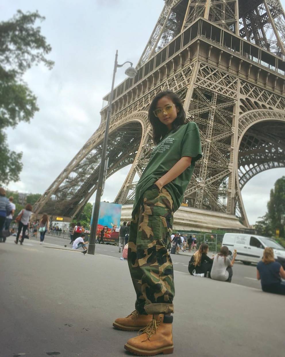 Với tông màu xanh quân đội là chủ đạo, cô nàng chọn những item oversized để tăng thêm chất bụi và phóng khoáng cho set đồ.