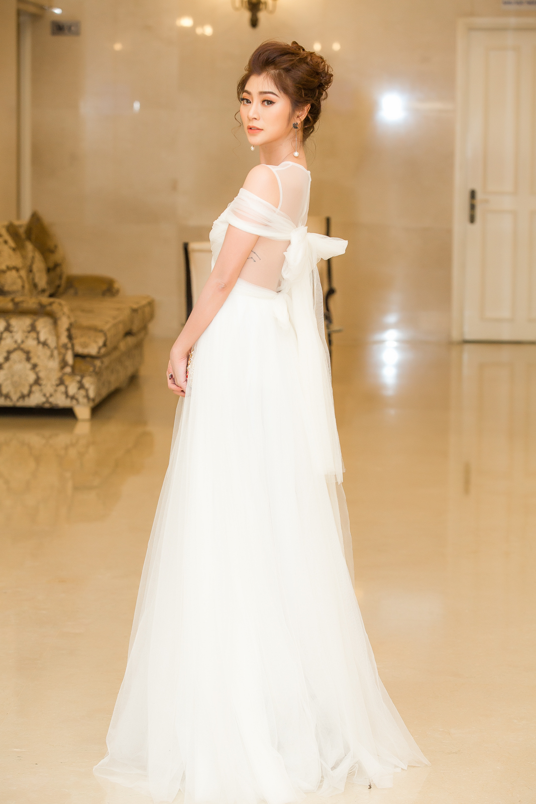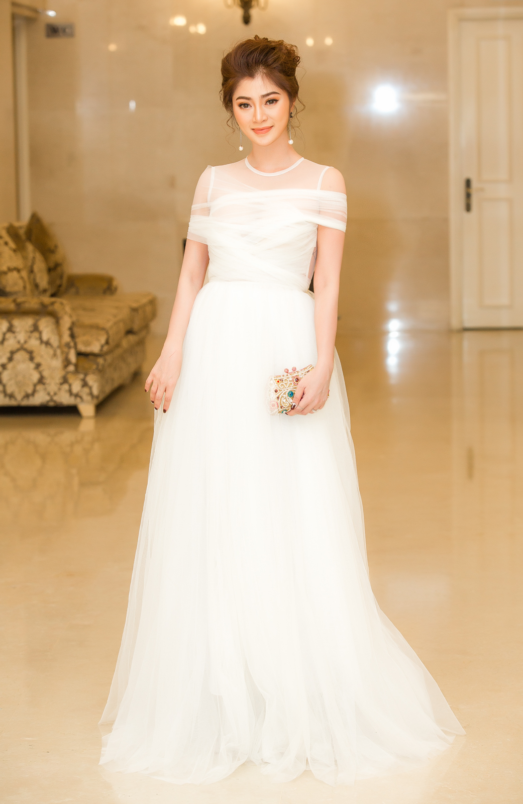 Cô chọn kiểu tóc xoăn búi cáo đánh rối tạo hình ảnh nhẹ nhàng, tinh khôi như một công chúa.