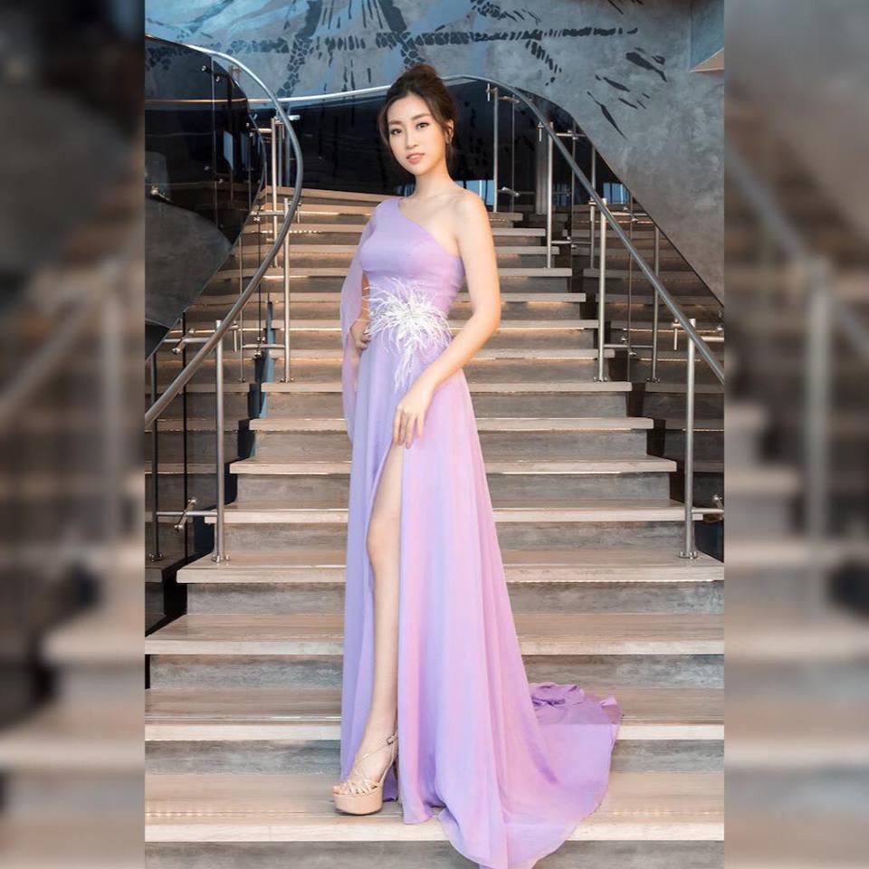 Hoa hậu Đỗ Mỹ Linh trong chiếc váy màu tím nhẹ nhàng kín đáo, song vẫn tạo được khoảng hở cần thiết, giúp người đẹp họ Đỗ khoe chân dài miên man trong sự kiện ra mắt trung tâm đào tạo Hoa hậu tại Việt Nam.