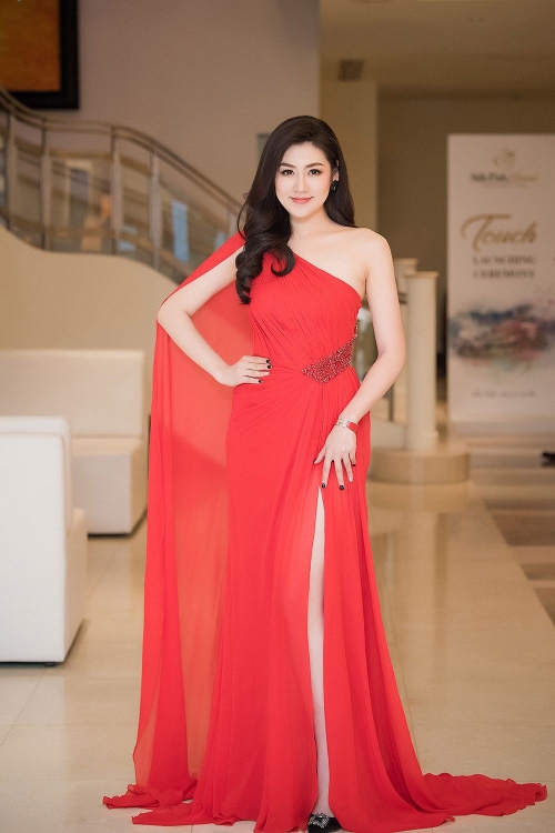 Á hậu Dương Tú Anh cũng “bắt chước” chọn đầm xẻ đùi như đàn chị Mai Phương Thúy. Cô diện với tần xuất “không biết chán”.